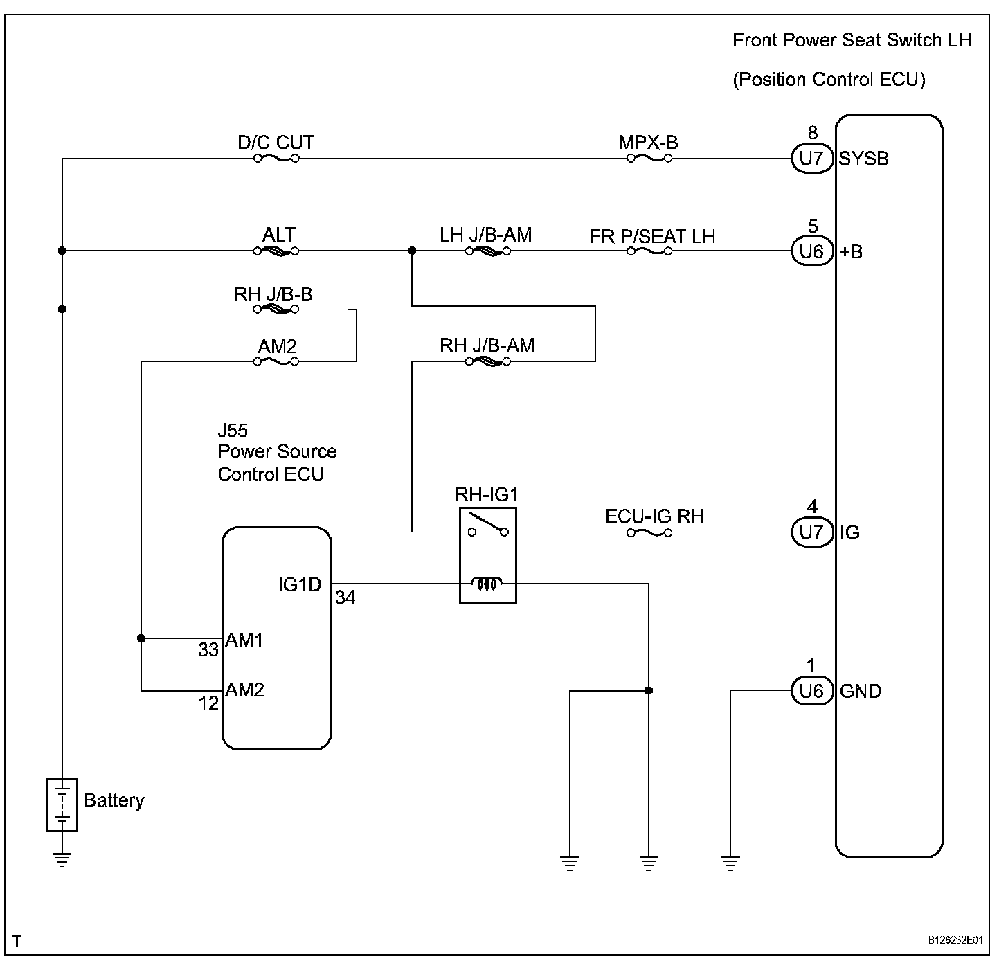 HINT: Manual adjustment of the slide, reclining, or lumbar can be performed even when the front power seat switch LH is not functional if current is allowed to flow into terminals +B and SYSB.