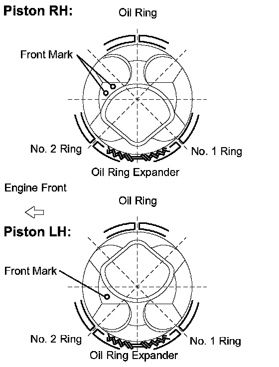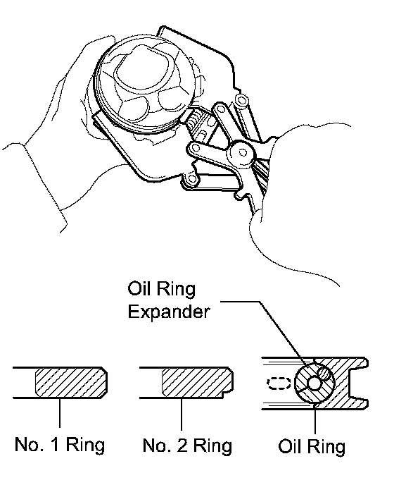 b. Using a piston ring expander, install the oil ring rail and 2 compression rings as shown in the illustration.
