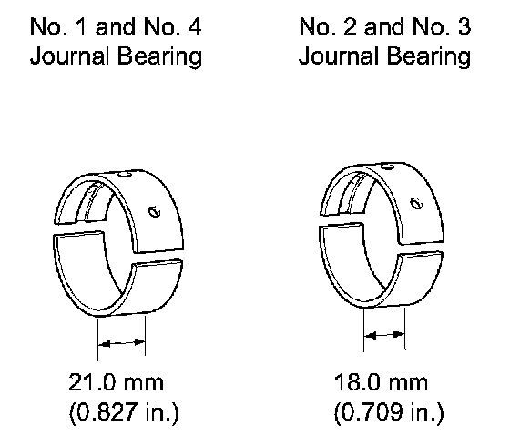NOTICE: Main bearings come in widths between 018.0 mm (0.709 inch) and 21.0 mm (0.827 inch). Install the 21.0 mm (0.827 inch) bearings in the No. 1 and No. 4 cylinder block journal positions with the main bearing cap. Install the 18.0 mm (0.709 inch) bearings in the No. 2 and No. 3 positions.