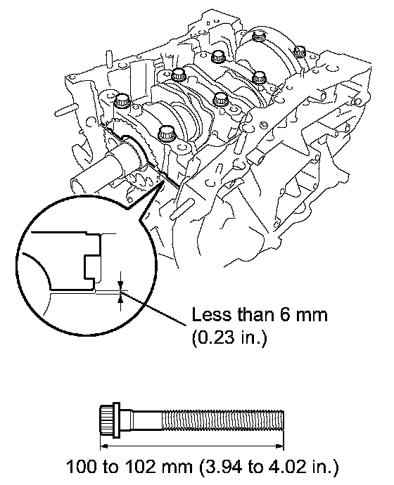 e. Insert the main bearing cap with your hand until the clearance between the main bearing cap and the cylinder block is less than 6 mm (0.23 inch) by marking the 2 internal bearing cap bolts as a guide.