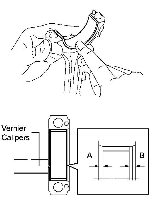 b. Using vernier calipers, measure the distance between the connecting rod's and bearing cap's edges and the connecting rod bearing's edge.