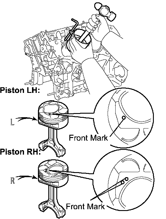c. Using a piston ring compressor, push the correctly numbered piston and connecting rod assembly into the cylinder with the front mark of the piston facing forward.