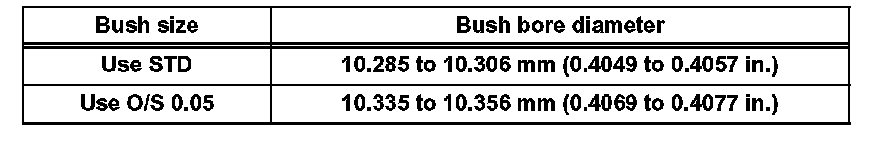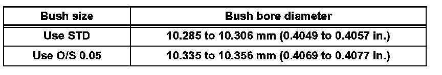 If the bush bore diameter of the cylinder head is greater than 10.306 mm (0.4057 inch), machine the bush bore to the dimension of 10.335 to 10.356 mm (0.4069 to 0.4077 inch) to install an O/S 0.05 valve guide bush. If the bush bore diameter of the cylinder head is greater than 10.356 mm (0.4077 inch), replace the cylinder head.