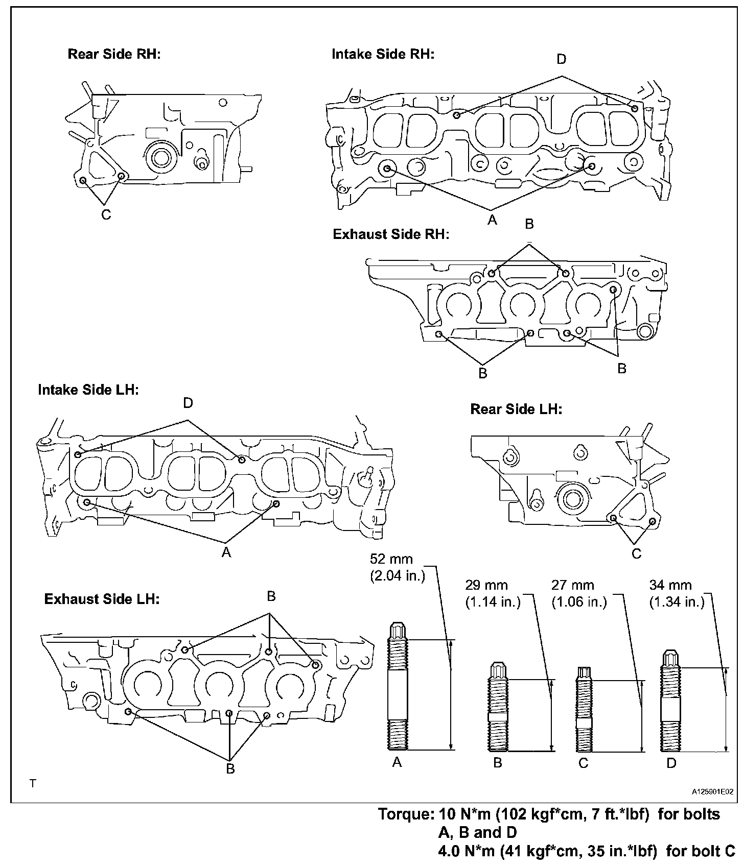 10 Nm (102 kgf-cm, 7 ft. lbs.) for bolts A, B and D