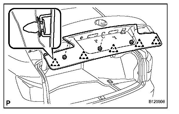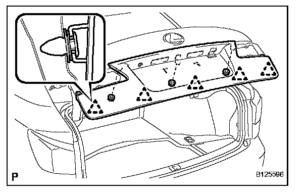 b. Disengage the 5 clips and remove the luggage compartment door garnish assembly.