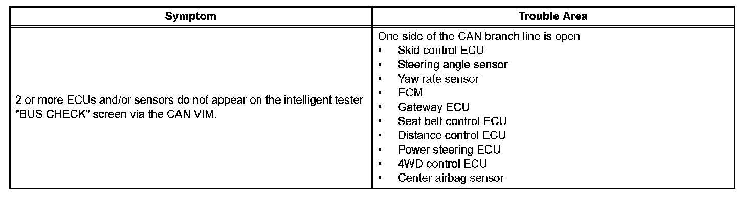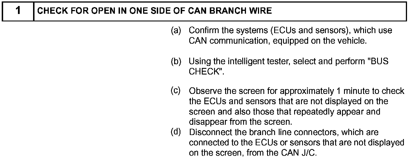HINT: If some ECUs and sensors repeatedly appear and disappear from the "BUS CHECK" screen, communication between the normal ECUs (sensors) and intelligent tester may be affected by the incomplete signals that are output from the ECU that has an open circuit in either of its CAN branch lines. In this case, the CAN branch lines for the ECUs and sensors that repeatedly appear and disappear from the screen are normal and the ECU that is not displayed on the screen may be the main cause of the problem (this ECU may have an open circuit in either of its CAN branch lines).