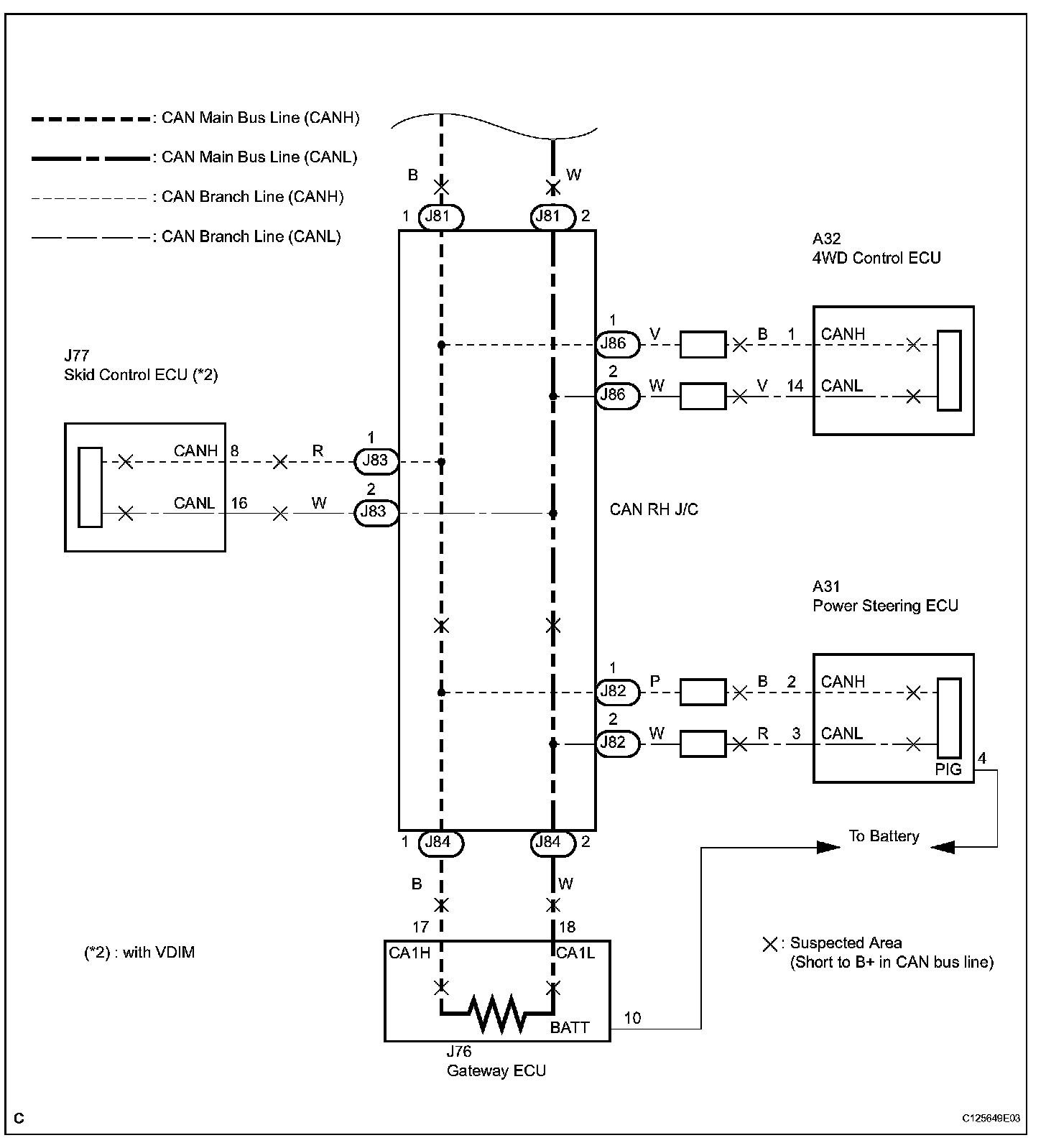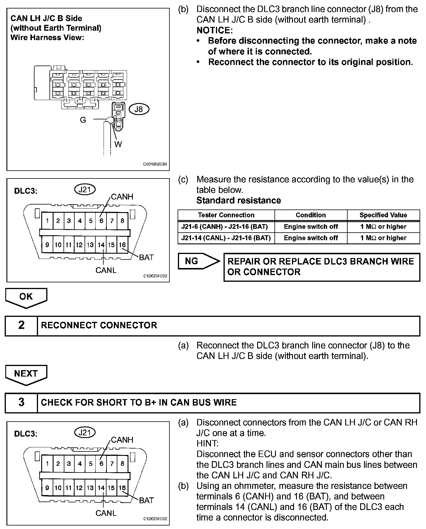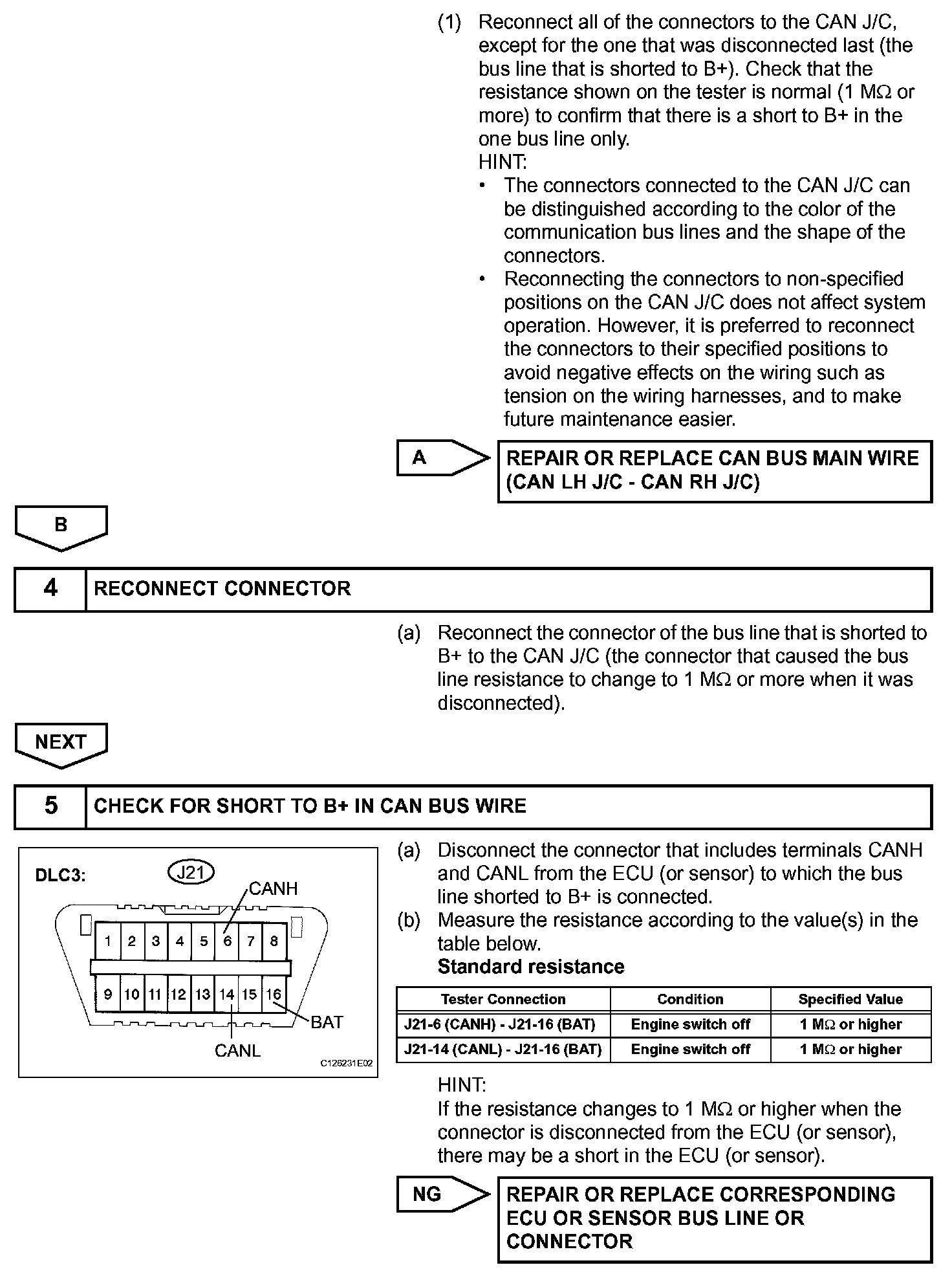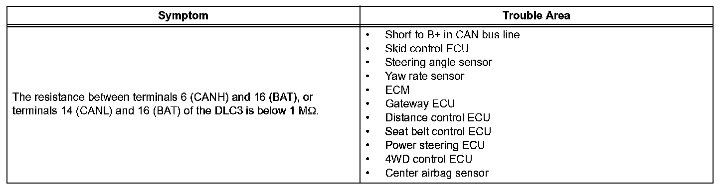 A short to B+ is suspected in the CAN bus line when the resistance between terminals 6 (CANH) and 16 (BAT), or terminals 14 (CANL) and 16 (BAT) of the DLC3 is below 1 MOhm.