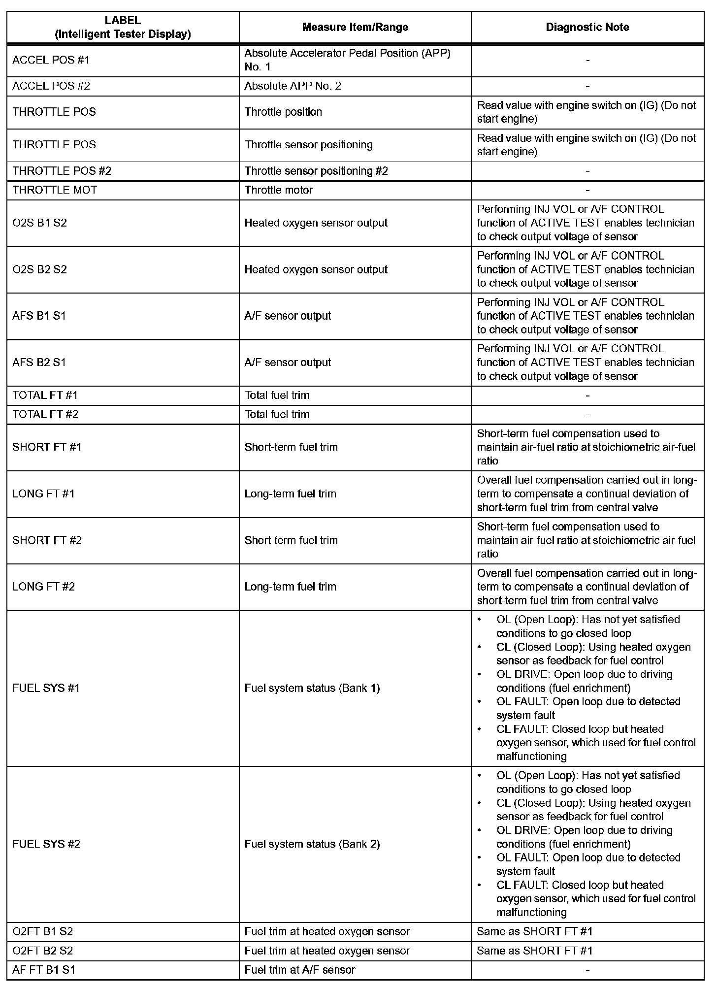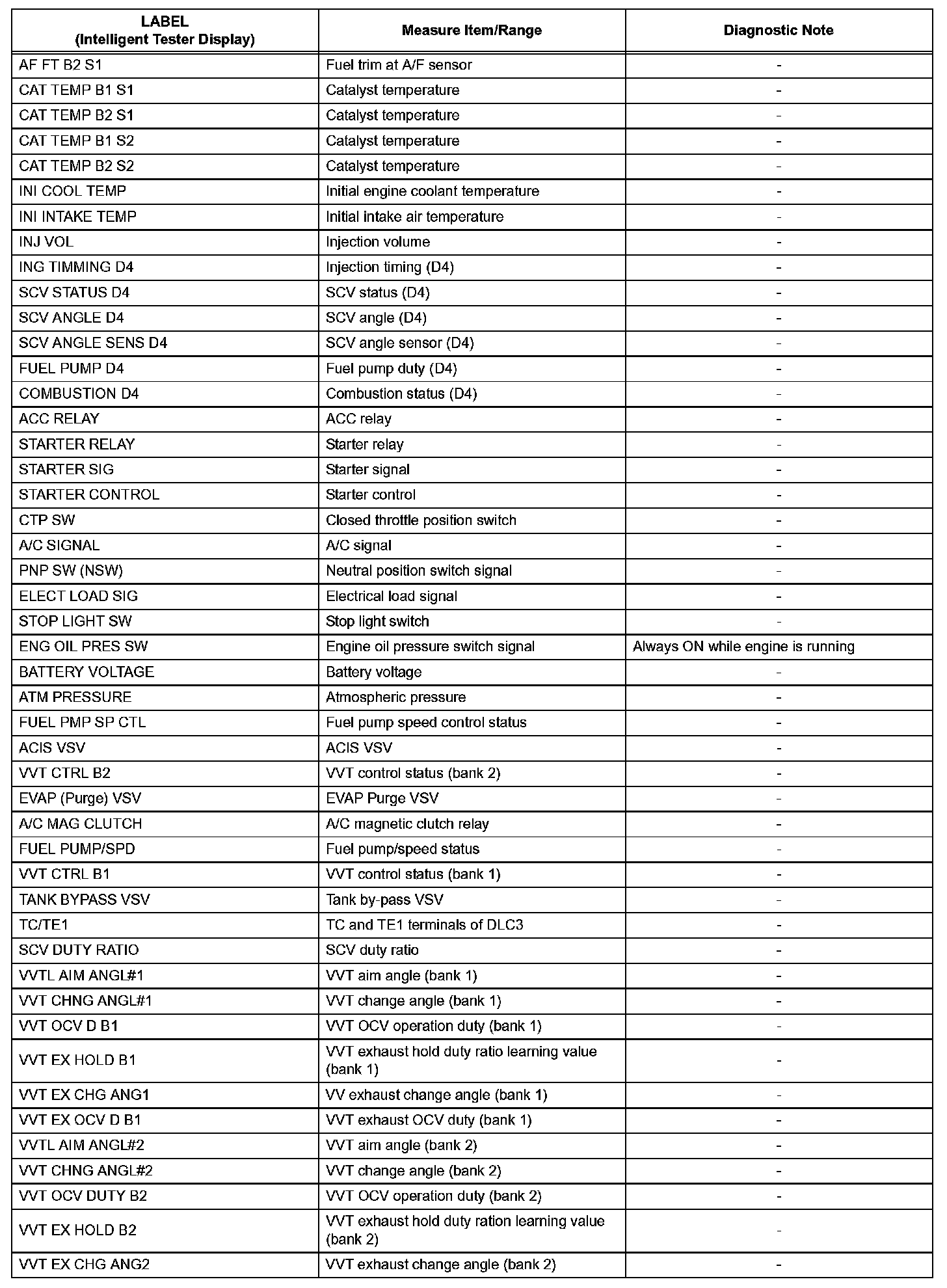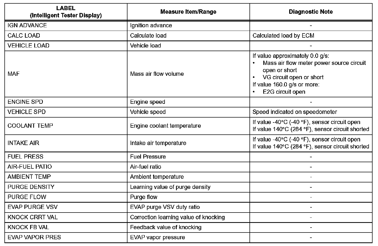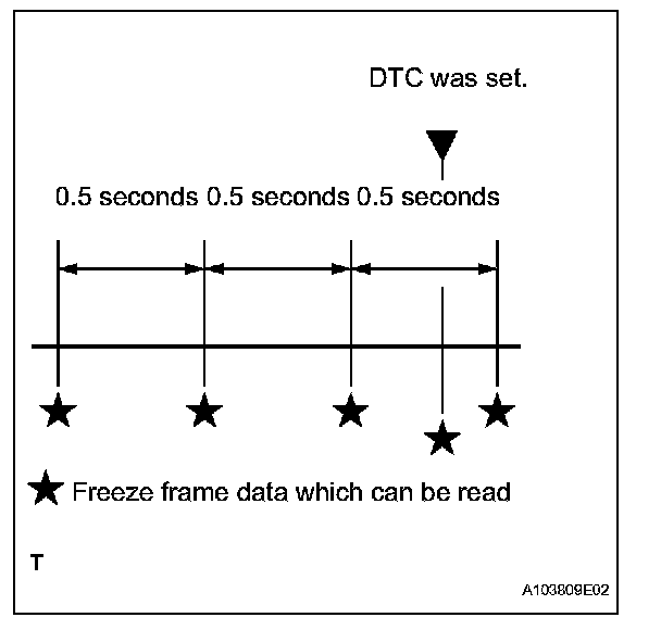 b. The ECM records engine conditions in the from of freeze frame data every 0.5 seconds. Using the intelligent tester, five separate sets of freeze frame data, including the data values at the time when the DTC was set, can be checked.