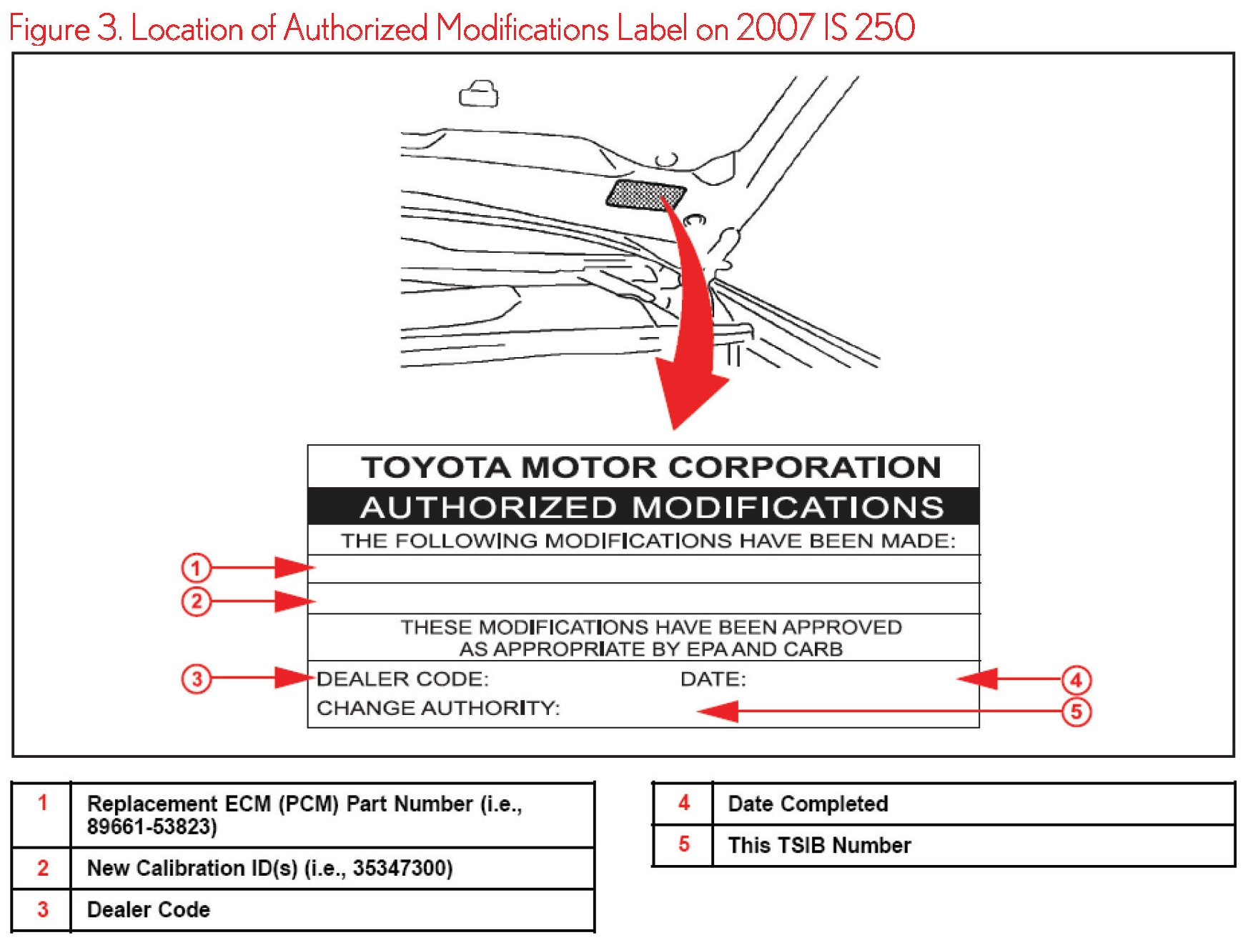 6. Check for the Authorized Modifications Label affixed to the vehicle in the location shown in Figure 3. Confirm if the ECM (PCM) calibration has been updated. If the calibration ID listed is NOT the latest ECM (PCM) calibration - go to step 7.