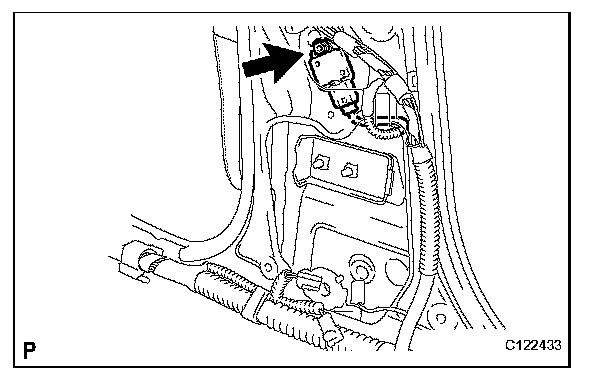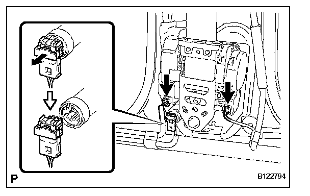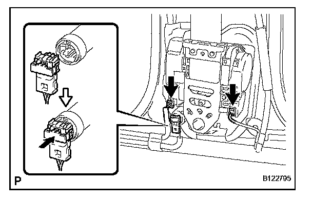 a. Using a screwdriver, pull out the locking button in the direction shown by the arrow to release the lock, and disconnect the pretensioner connector as shown in the illustration.