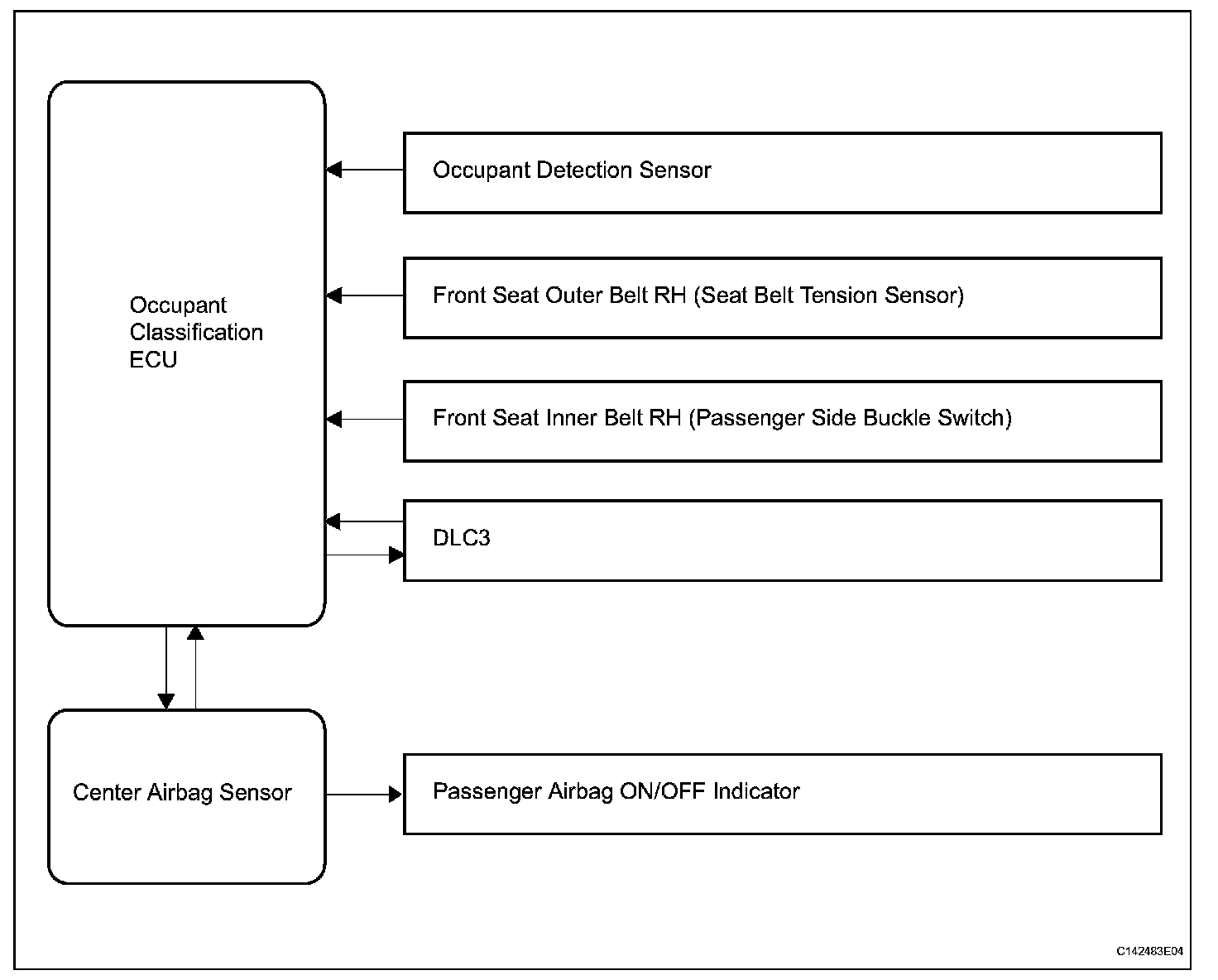 a. In the occupant classification system, the occupant classification ECU calculates the weight of the front passenger based on a signal from the occupant detection sensor. This system judges the occupant to be a child when it detects a weight of less than 27.3 kg (60 lb), and disables the front passenger side airbag and front passenger side - side airbag.