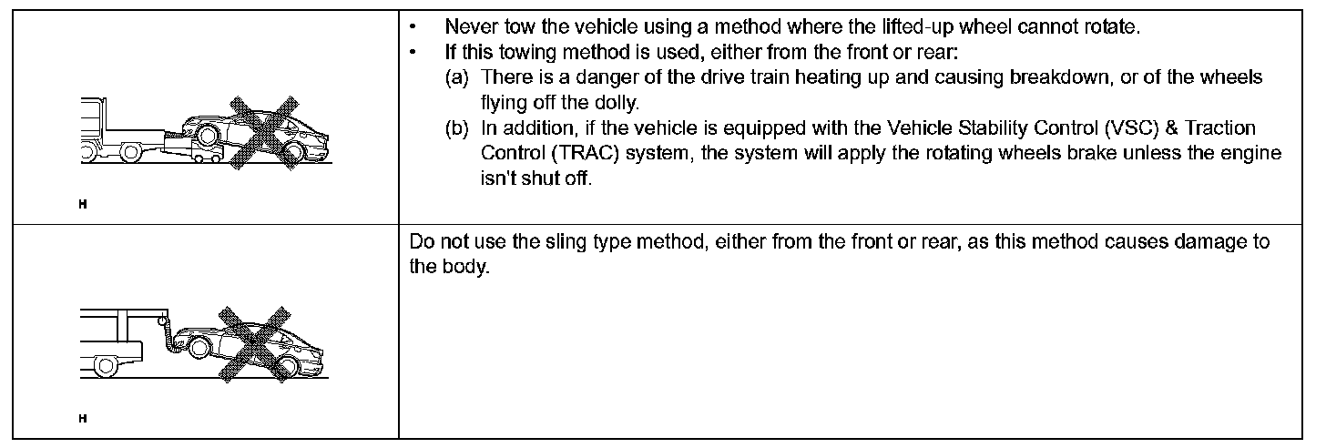 - For example, the towing methods shown are dangerous or damage the vehicle, so do not use them.
