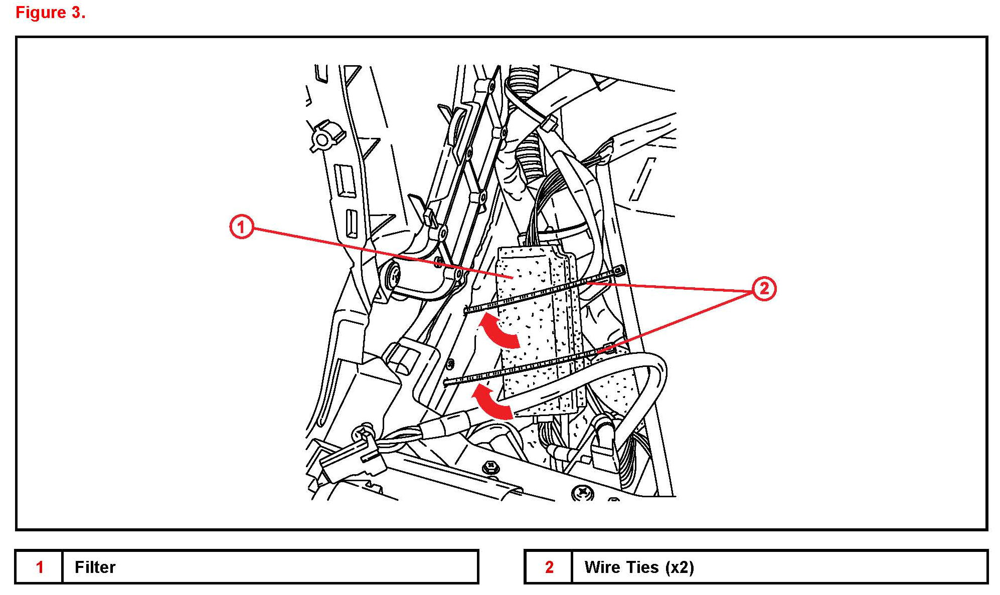 B. Secure the filter to the vehicle wire harness using wire ties.
