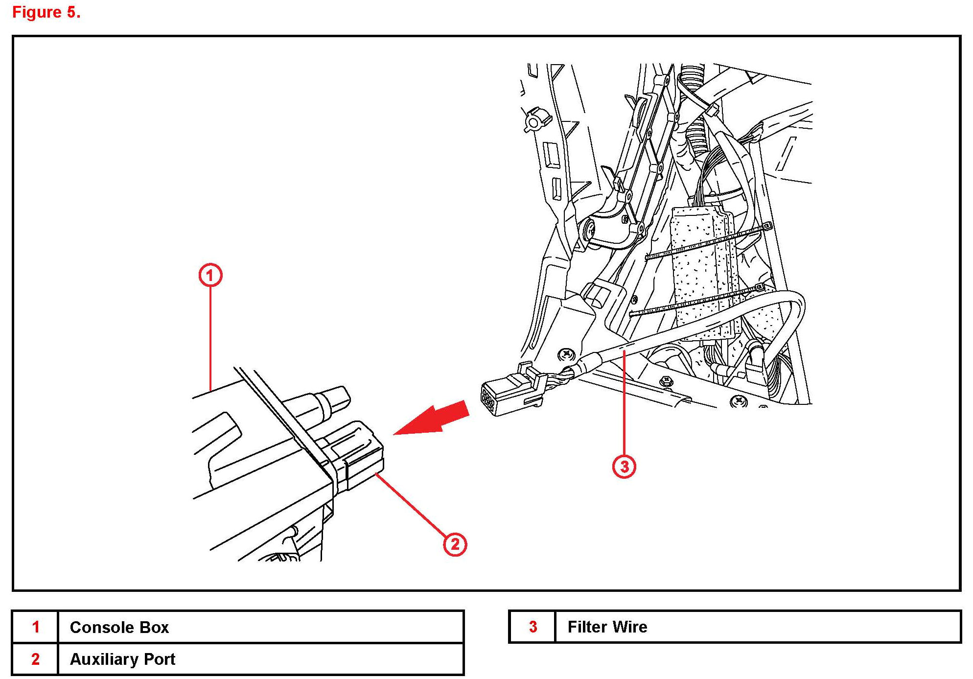 Some customers may notice noise in the auxiliary mode of the radio when using an MP3 player or other external audio source connected to the 12V power port of the vehicle. An improved auxiliary port and in-line filter has been developed to improve this condition. Use the repair procedure to install the new in-line filter and auxiliary port.