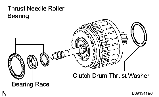 b) Remove the clutch drum thrust washer, 2 thrust needle roller bearings and bearing race.