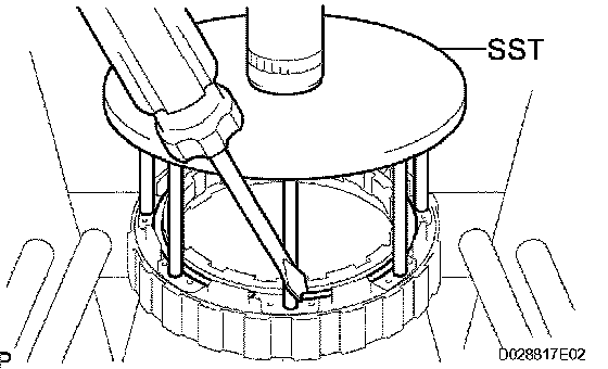 a) Using SST, a screwdriver and a press, remove the snap ring.