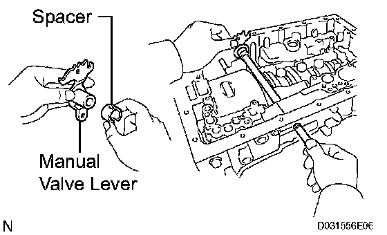 b) Install the manual valve lever shaft to the transmission case through the manual valve lever.