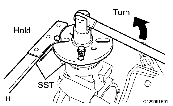b) Using SST to hold the flange, remove the drive pinion nut.
