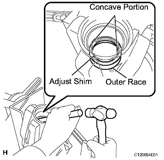 b) Using a brass bar and hammer, remove the outer race of the front drive pinion front tapered roller bearing and front adjust shim from the differential carrier assembly.