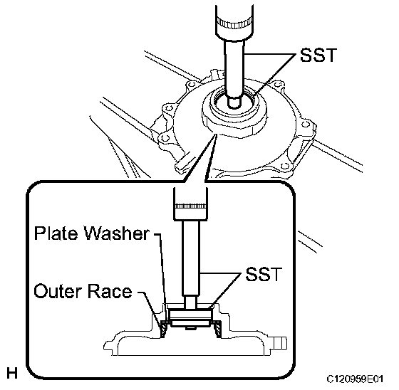 a) Using SST and a press, remove the RH outer race of the front differential case bearing and case plate washer from the differential side bearing retainer.