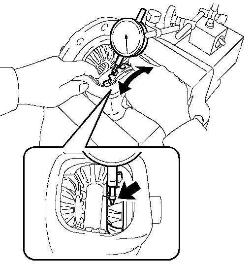 b) Measure the side gear backlash while holding 1 pinion gear toward the differential case.