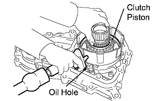 b) While pushing down evenly on the center differential clutch piston, apply air (200 kPa, 2.0 kgf/cm2, 19 psi) into the oil hole on the transfer chain case rear as shown in the illustration to remove the center differential clutch piston from the transfer direct clutch drum.