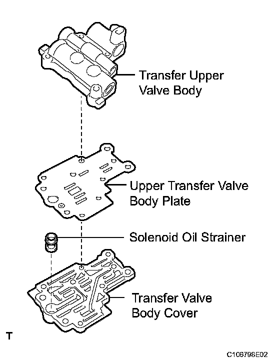c) Remove the solenoid oil strainer from the transfer valve body cover.