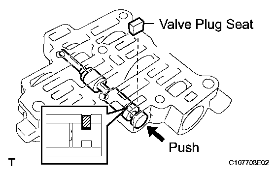 a) While pushing on the center differential clutch control valve plug, remove the center differential clutch control valve plug seat from the transfer upper valve body.