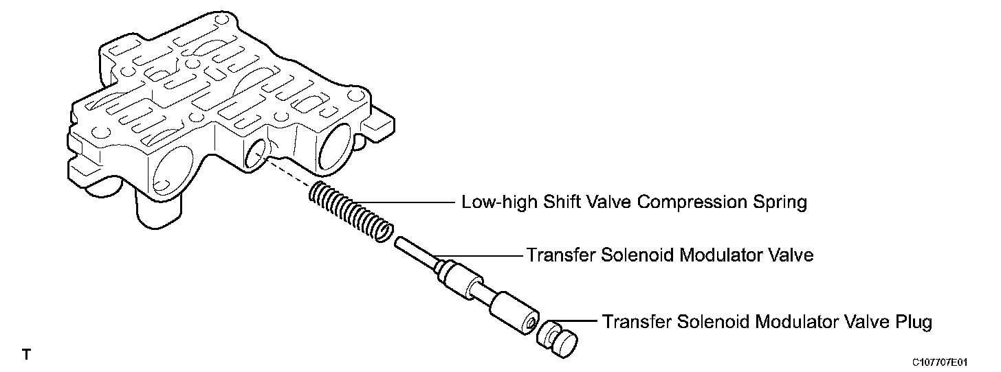 b) Remove the transfer solenoid modulator valve plug, transfer solenoid modulator valve and low-high shift valve compression spring from the transfer upper valve body