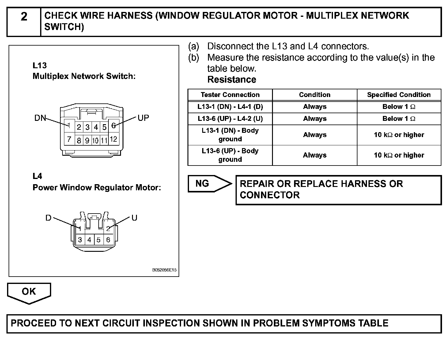 This circuit transmits signals from the multiplex network switch to the power window regulator motor.