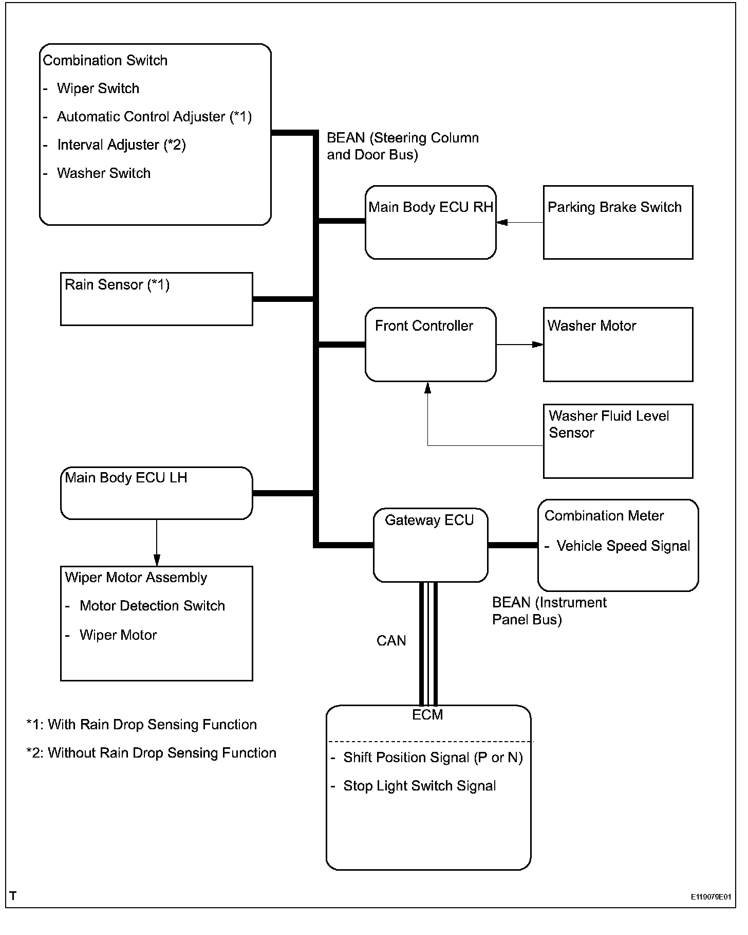 - The main body ECU LH adjusts the wiper timing based on commands from the rain sensor. These adjustments are based on vehicle speed and a determination of the vehicle driving and stopping conditions during automatic operation.