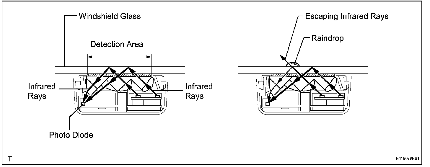 - If raindrops are present in the detection area, a portion of the emitted infrared rays penetrate the windshield glass due to the change in the difference of the index of refraction between the glass and the area outside the windshield (difference between air and water). The ability of the windshield glass to reflect the emitted rays back inside change due to the presence of raindrops. This reduces the amount of infrared rays that are received by the photo diode. The amount of this reduction is then used to determine the amount of raindrops. Thus, this function selects the INT, LO, and HI wiper operation in order to operate the wipers at an optimal speed and timing.