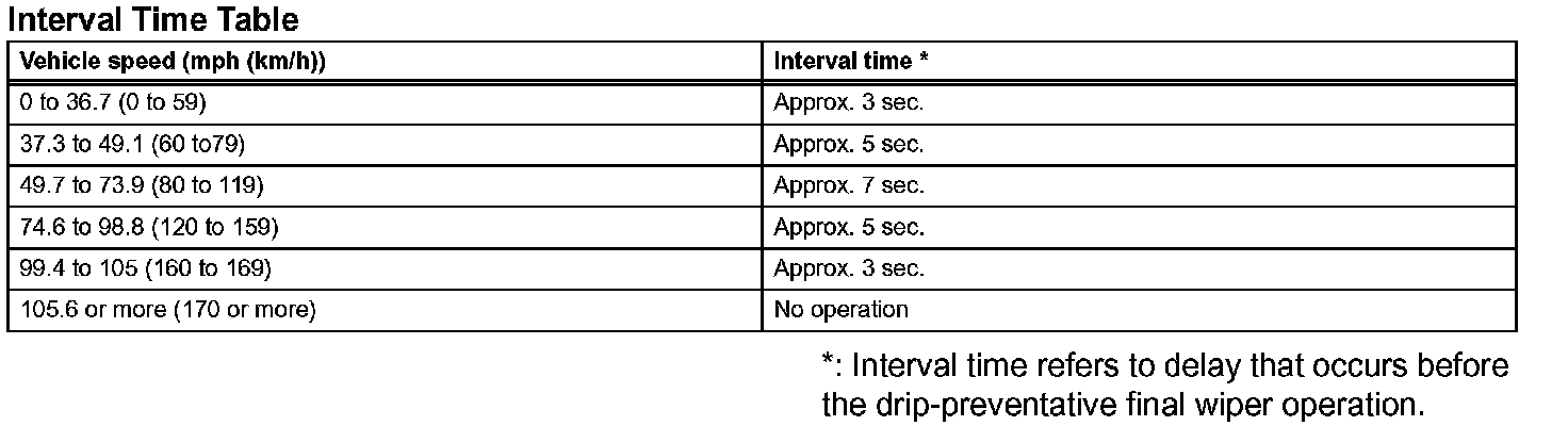 2. As shown in the given chart, after the end of this operation, the wiper operates once more. It does so after an interval time (between 3 to 7 seconds) determined based on the vehicle speed so that any washer fluid drips are wiped away. The speed signal used for this function is sent by the combination meter, and received by the main body ECU LH.