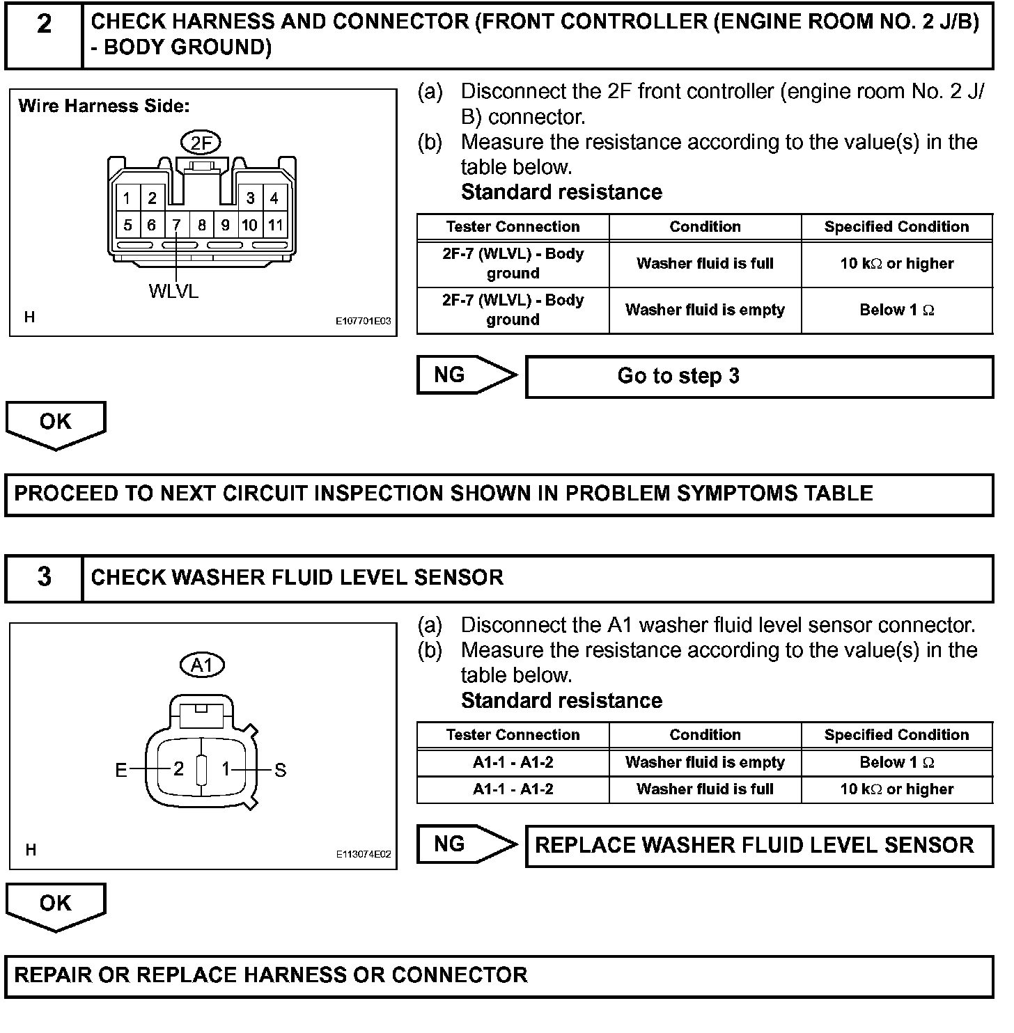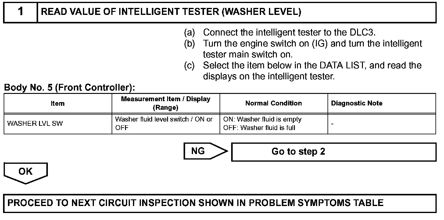 The combination meter receives this information, and turns on the washer fluid level warning light when the washer fluid becomes low.