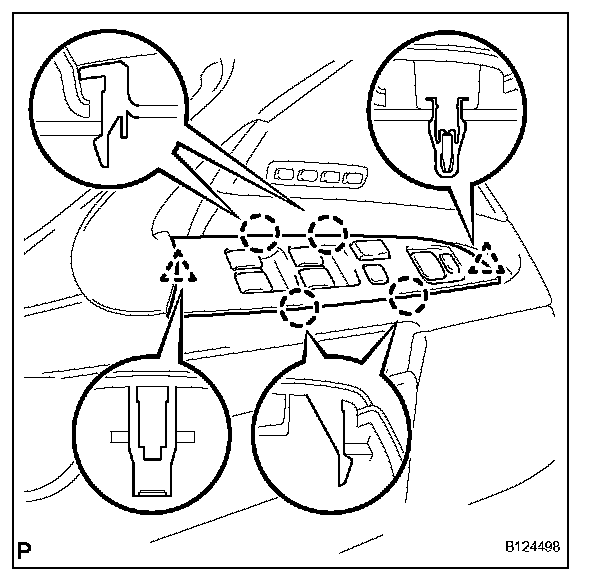b. Engage the 2 clips and 4 claws, and install the power window regulator master switch assembly.