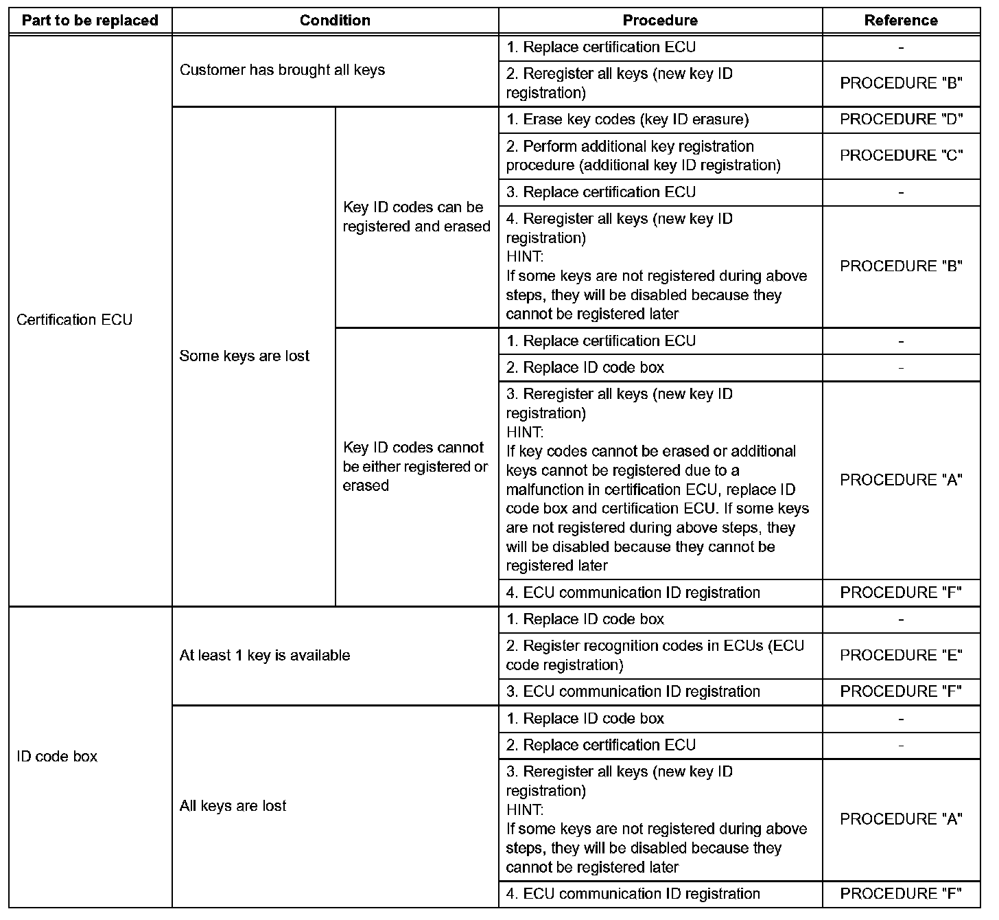 - If all of the registered keys are not available, replacement of the ID code box is also required.