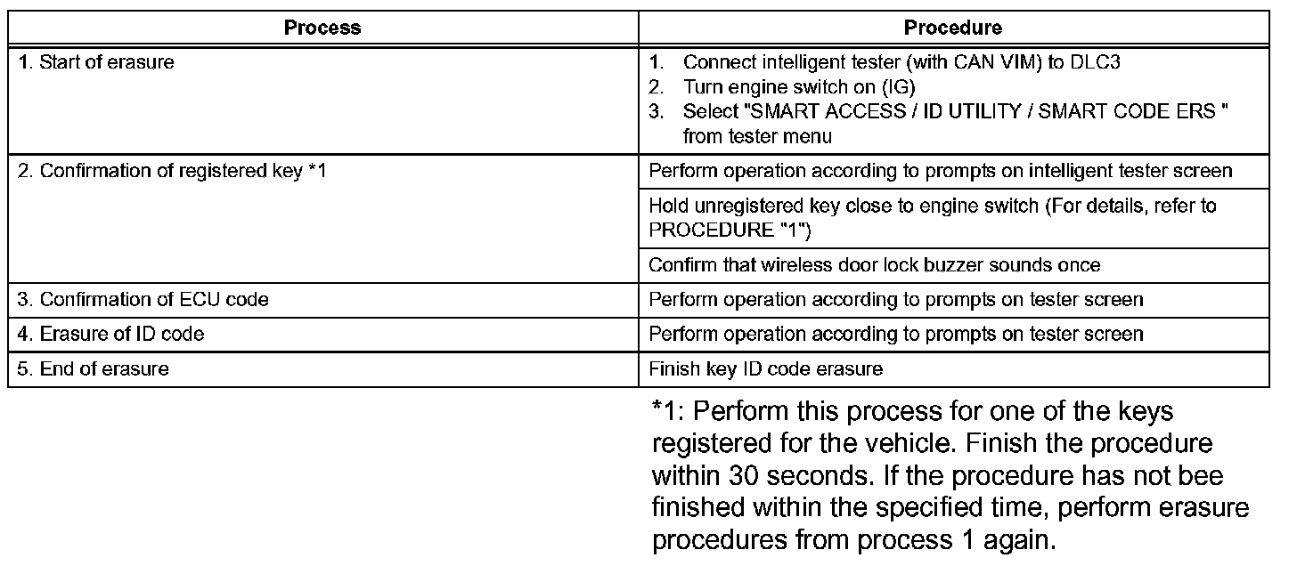 a. The table shows ECU replacement and key registration procedures in case the malfunctioning ECU has been specified after troubleshooting the smart access system with push-button start.