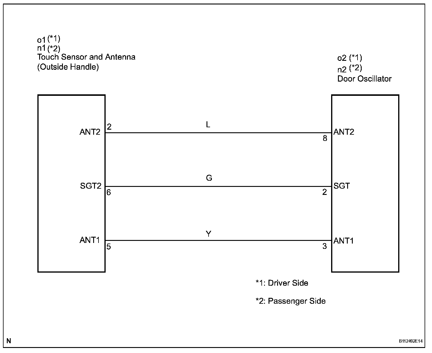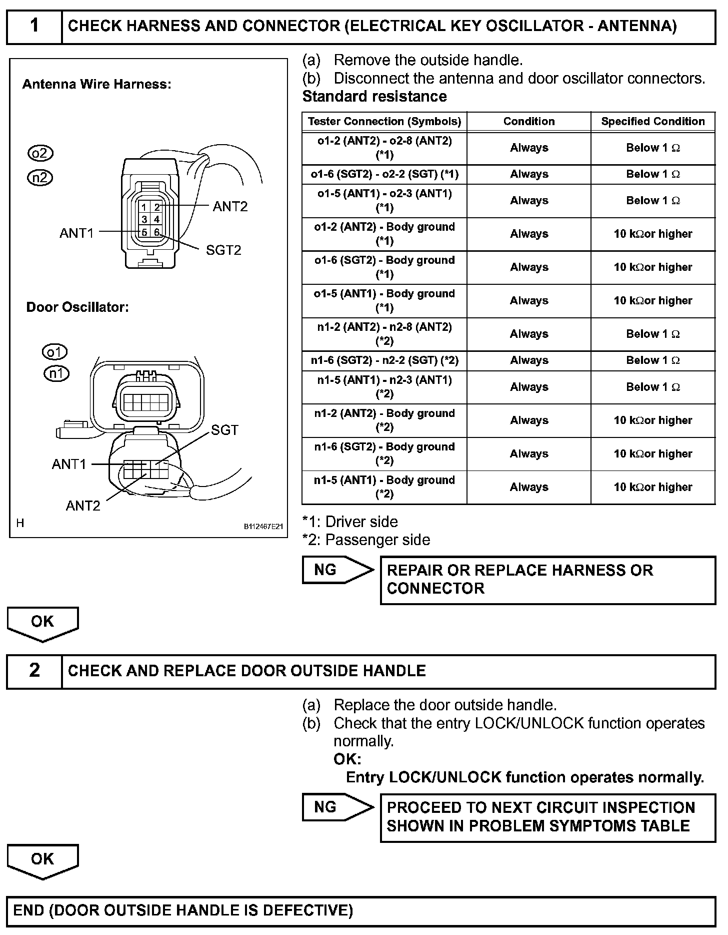 Terminals ANT1 and ANT2 of the antenna (door outside handle) detect if the electrical key is within the action area around the door outside handle.