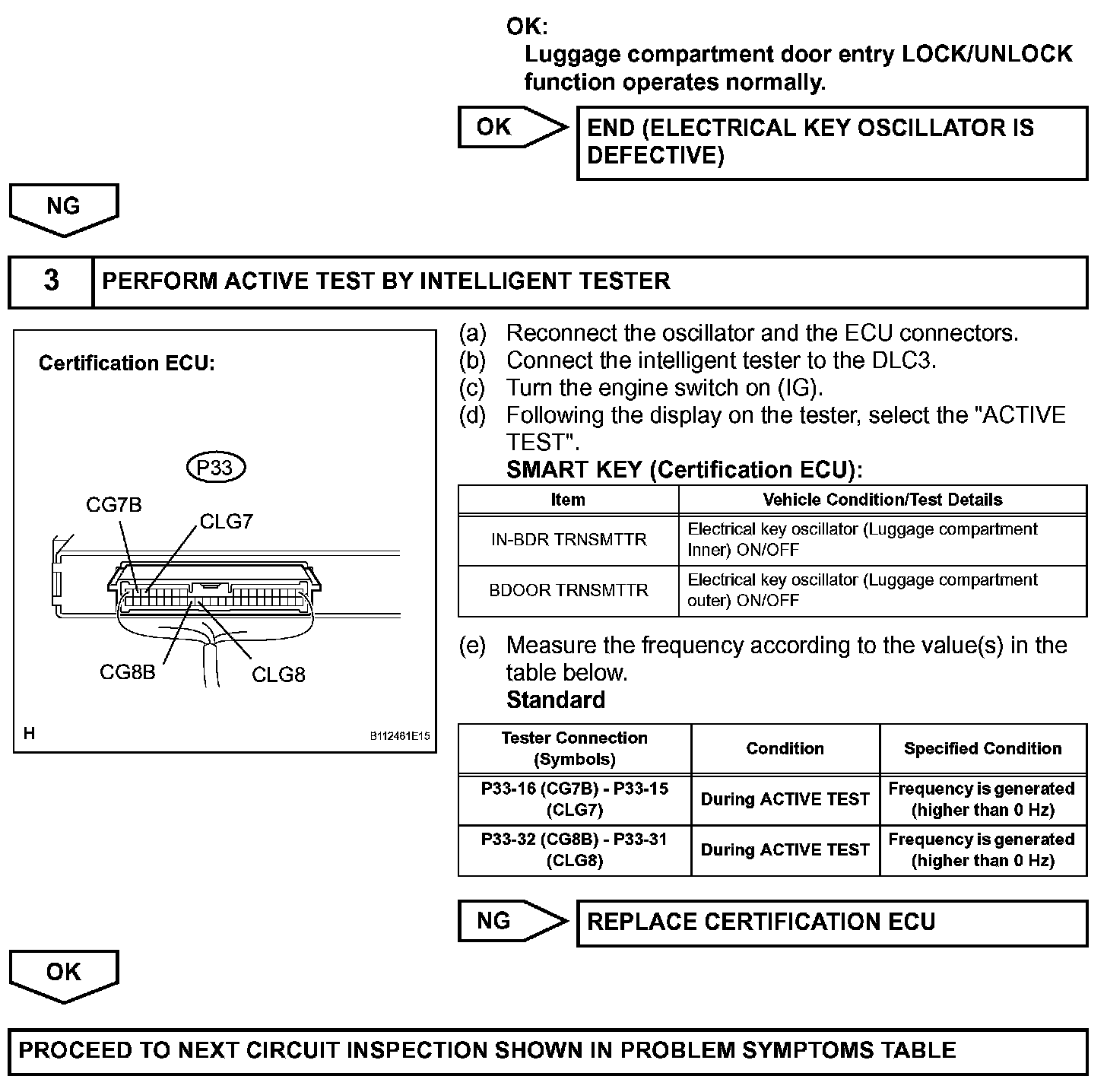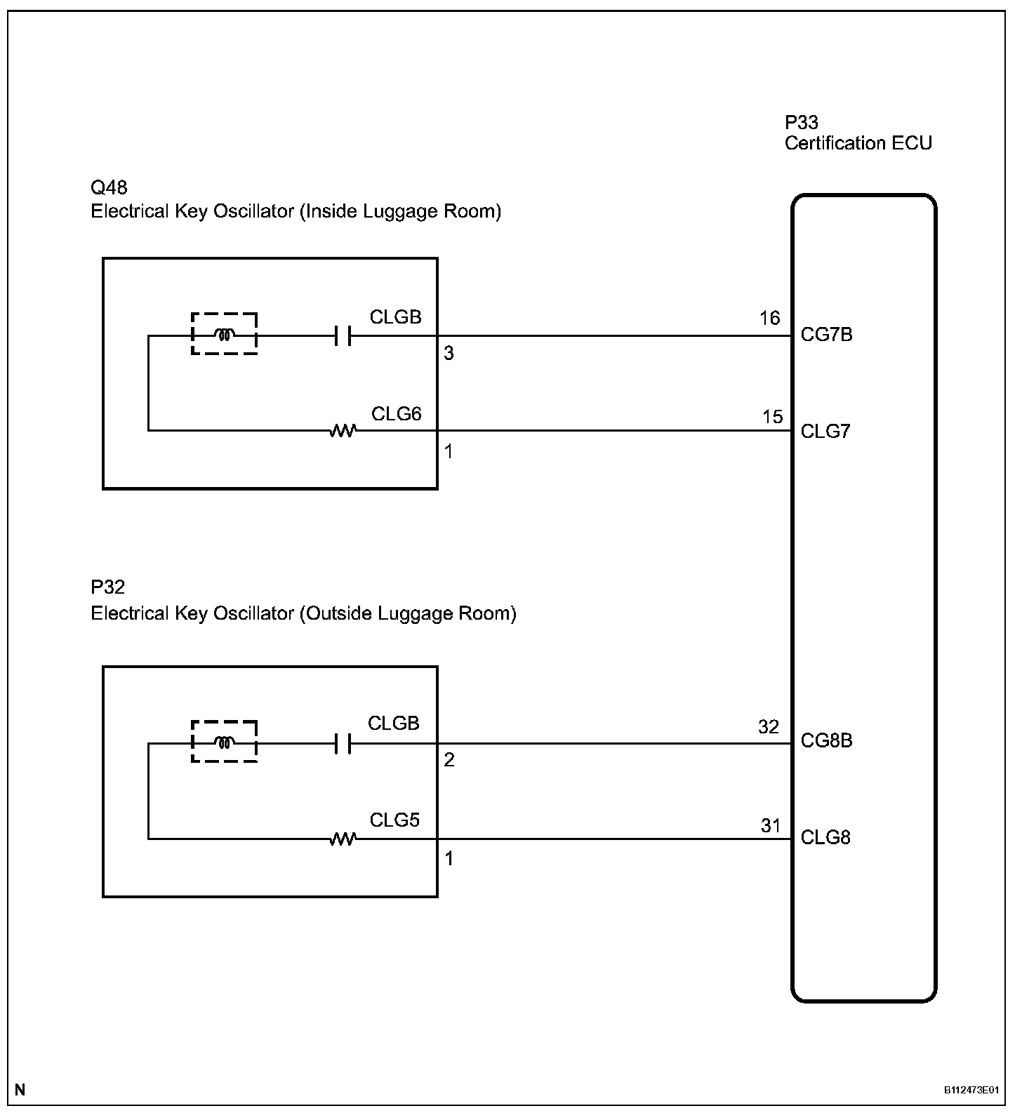 The certification ECU activates the inner and outer luggage compartment oscillators. The power is supplied from the certification ECU to both the inner and outer luggage compartment oscillators. The inner and outer luggage compartment oscillator circuits have the same wiring. If the entry luggage compartment function has a malfunction, check the circuit for a malfunctioning oscillator.