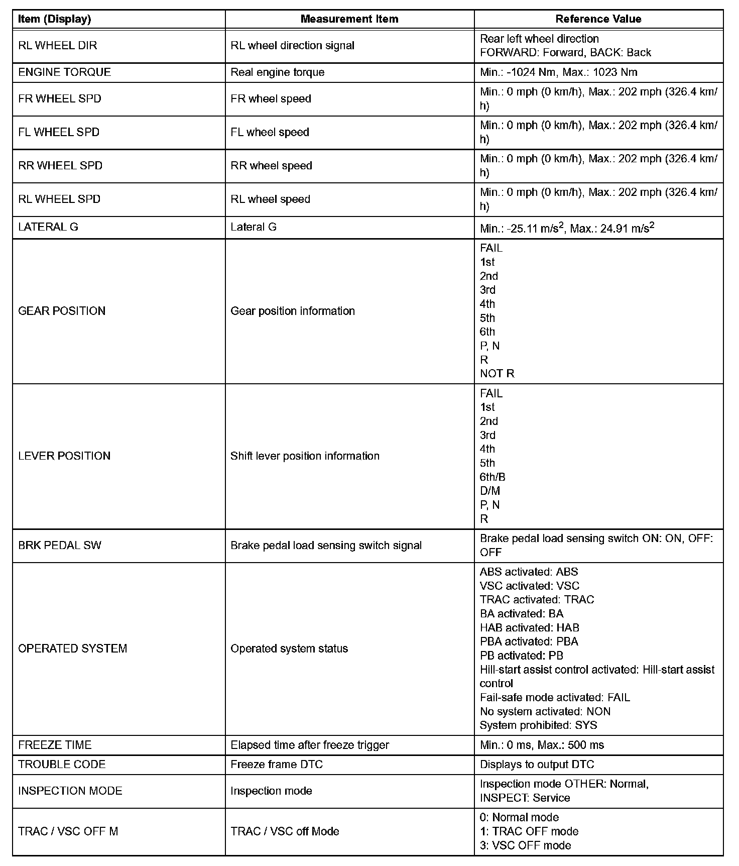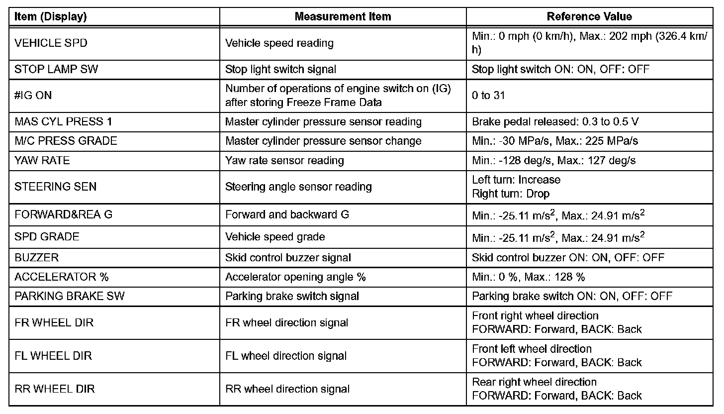- Freeze Frame Data at the time a DTC is detected: When the skid control ECU stores data at the time a DTC is detected, no updates will be performed until the data is cleared.