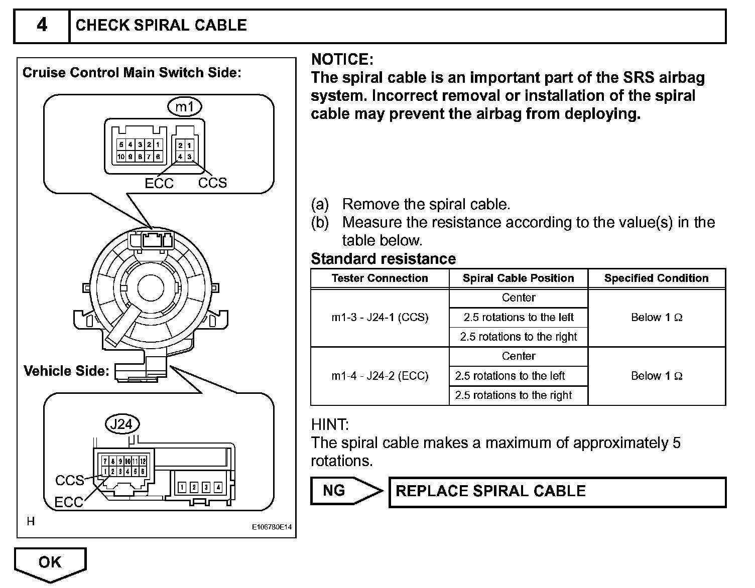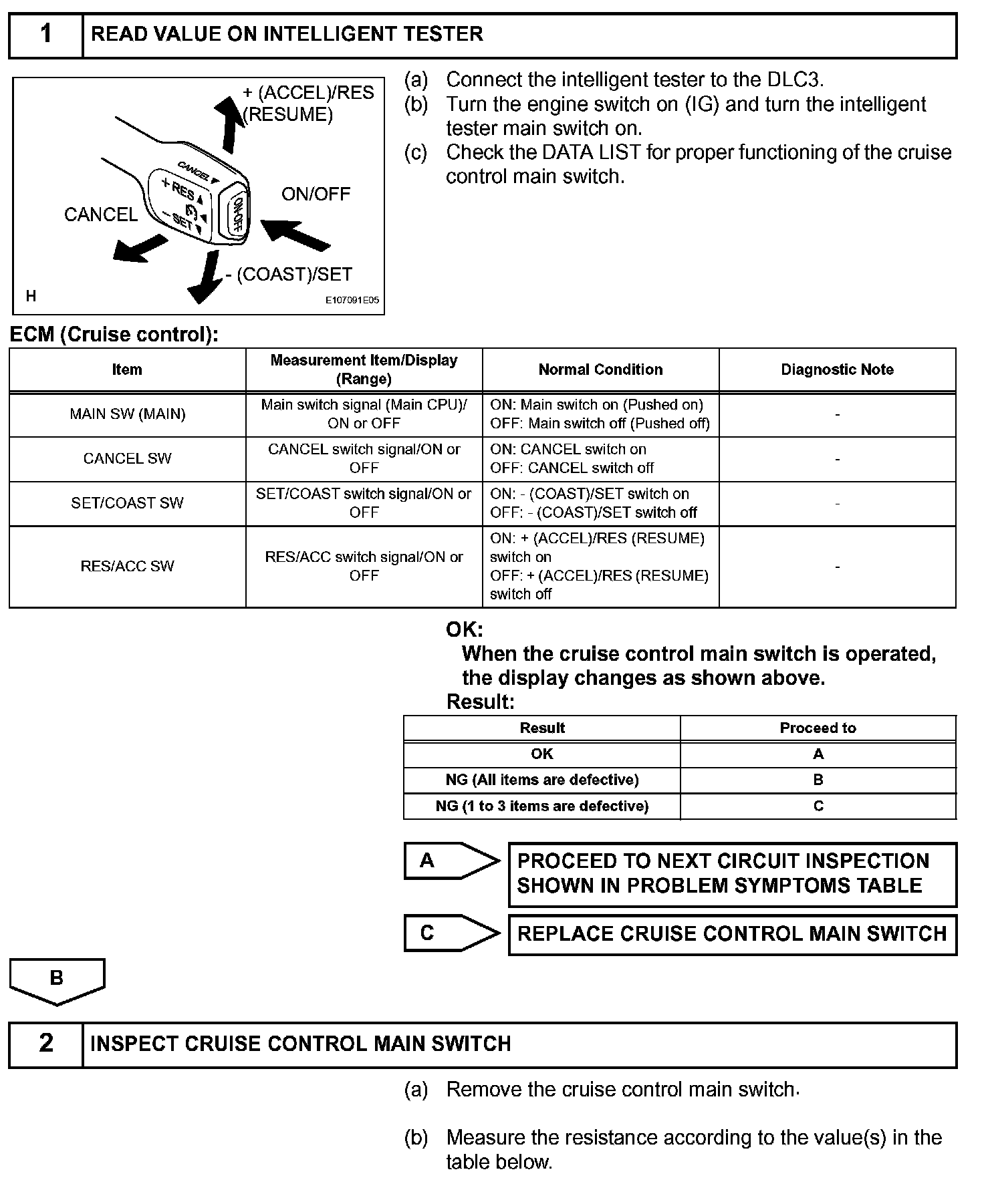 The cruise control main switch operates 7 functions: SET, - (COAST), TAP-DOWN, RES (RESUME), + (ACCEL), TAP-UP, and CANCEL. The SET, TAP-DOWN, and - (COAST) functions, and the RES (RESUME), TAP-UP, and + (ACCEL) functions are operated with the same switch. The cruise control main switch is an automatic return type switch which turns on only while operating it in the direction of each arrow and turns off after releasing it. The internal contact point of the cruise control main switch is turned on with the switch operation. Then the ECM reads the voltage value that has been changed by the switch operation to control SET, - (COAST), RES (RESUME), + (ACCEL), and CANCEL.