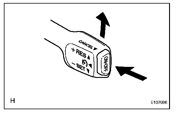 4. Check that vehicle speed increases while the cruise control main switch is pushed to + (ACCEL)/RES (RESUME), and that the vehicle cruises at the newly set speed when the switch is released.