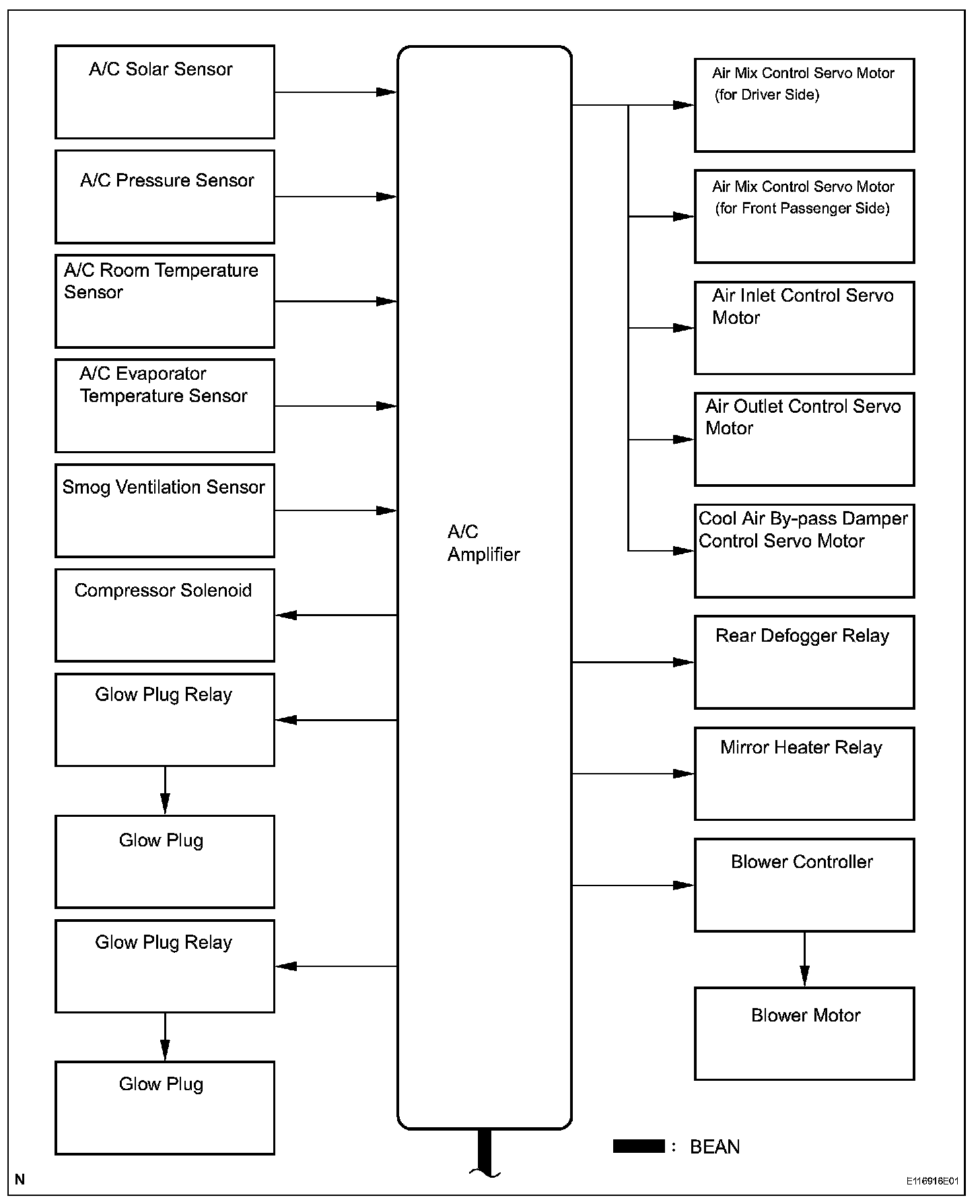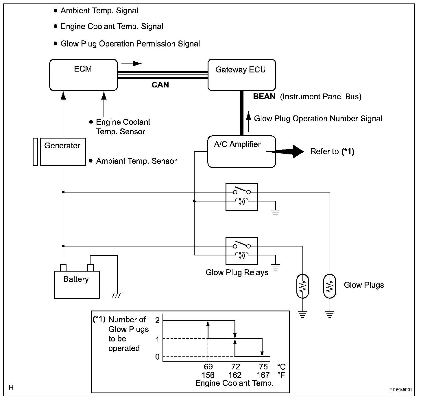 2. The A/C amplifier and ECM determine the number of glow plugs to operate based on the engine coolant temperature, outside temperature, and A/C Max. Hot state. The A/C amplifier then transmits request signals to the ECM.