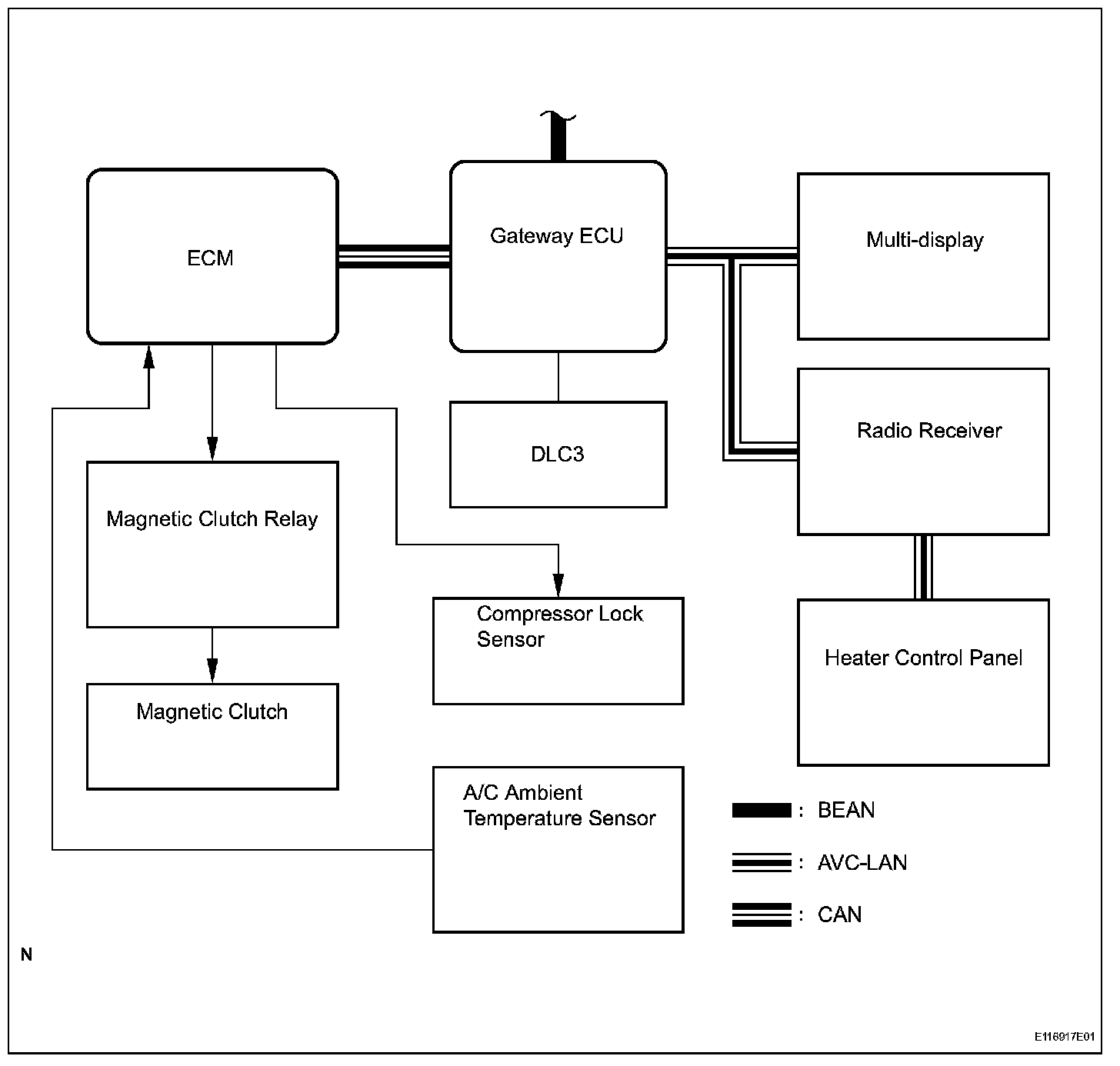 The lock sensor sends an A/C pulley speed signal to the ECM. The ECM compares this signal with an engine speed signal sent from the crankshaft position sensor. If the ECM determines that the A/C pulley has locked, the ECM turns the magnetic clutch off.