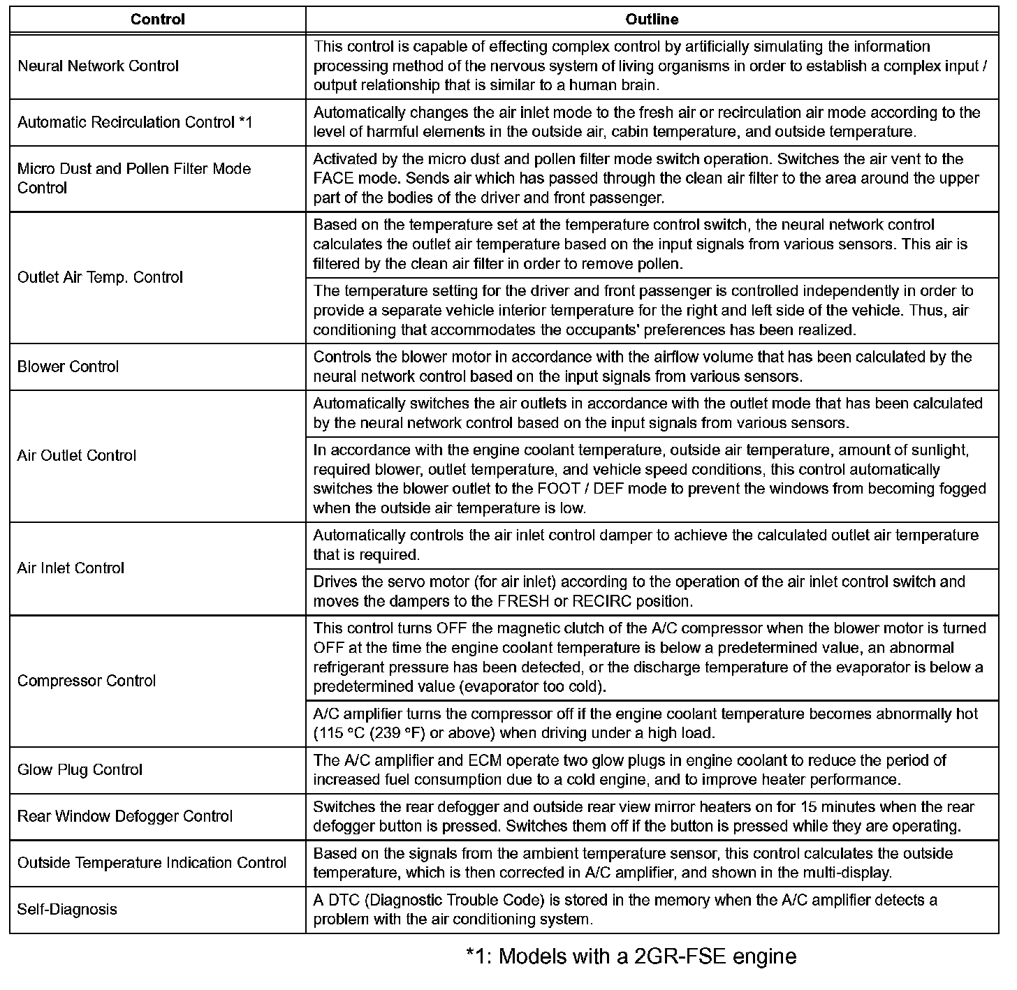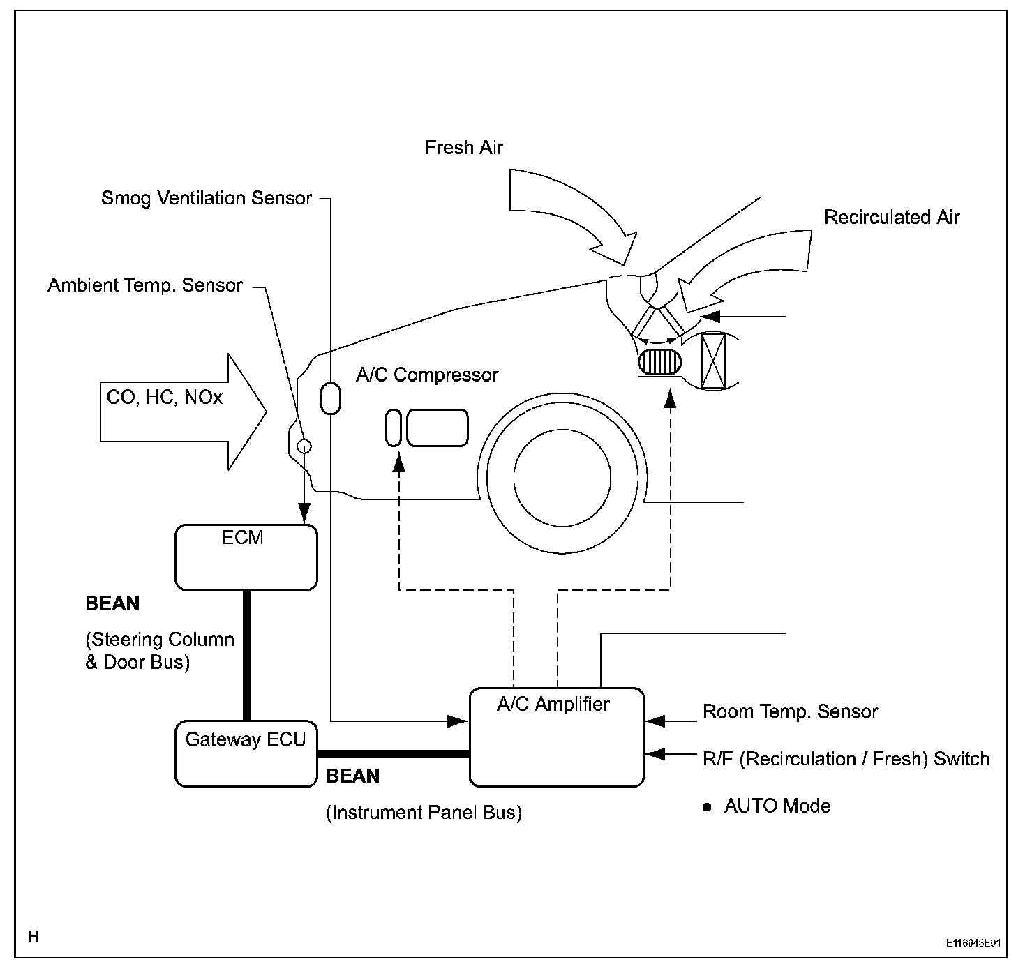 1. The A/C amplifier detects harmful elements (CO, HC, and NOx) based on smog ventilation sensor signals and automatically switches the air inlet mode to the recirculate air mode to prevent such harmful elements from entering the cabin.