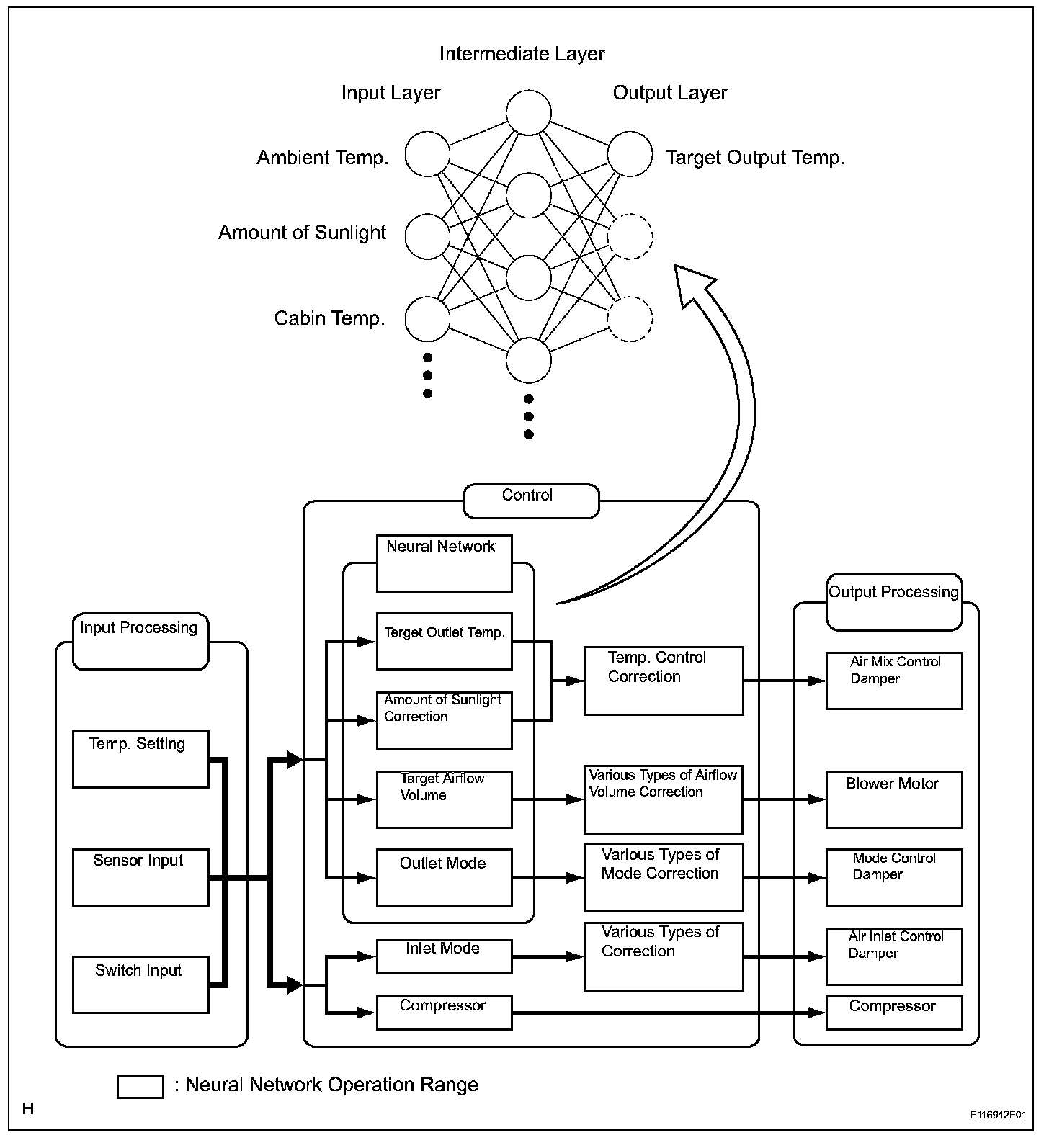 - The neural network control consists of neurons in the input layer, intermediate layer, and output layer. The input layer neurons process the input data of the outside temperature, the amount of sunlight, and the room temperature based on the outputs of the switches and sensors, and output them to the intermediate layer neurons. Based on this data, the intermediate layer neurons adjust the strength of the links among the neurons. The sum of these is then calculated by the output layer neurons in the form of the required outlet temperature, solar correction, target airflow volume, and outlet mode control volume. Accordingly, the A/C amplifier controls the servo motors and blower motor in accordance with the control volumes that have been calculated by the neural network control.