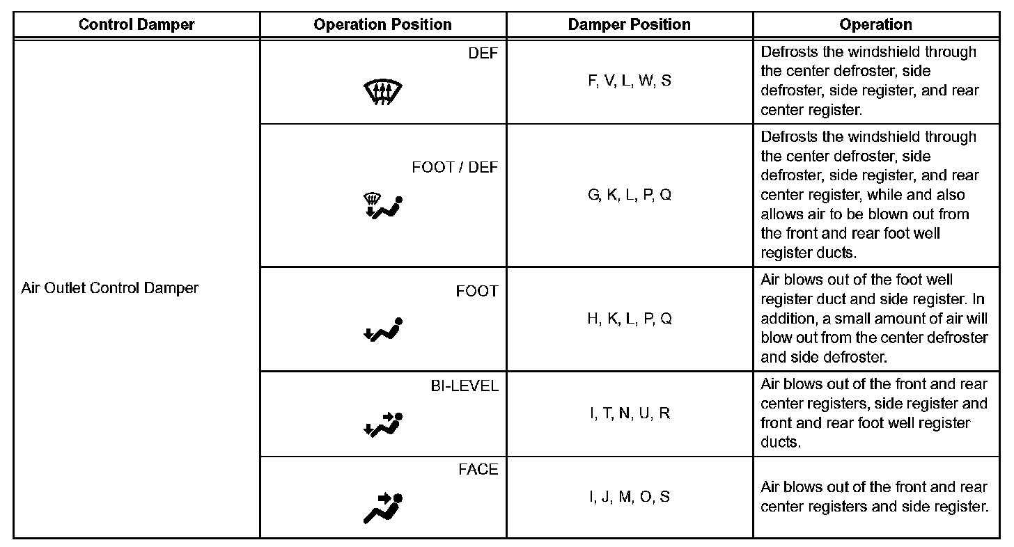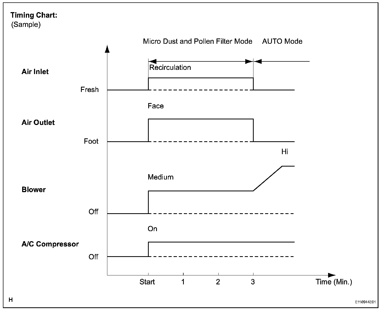 1. When the micro dust and pollen filter switch signal is input to the A/C amplifier, the A/C amplifier controls the A/C compressor, air inlet control servo motor, air outlet control servo motor and blower motor as shown in the timing chart given.