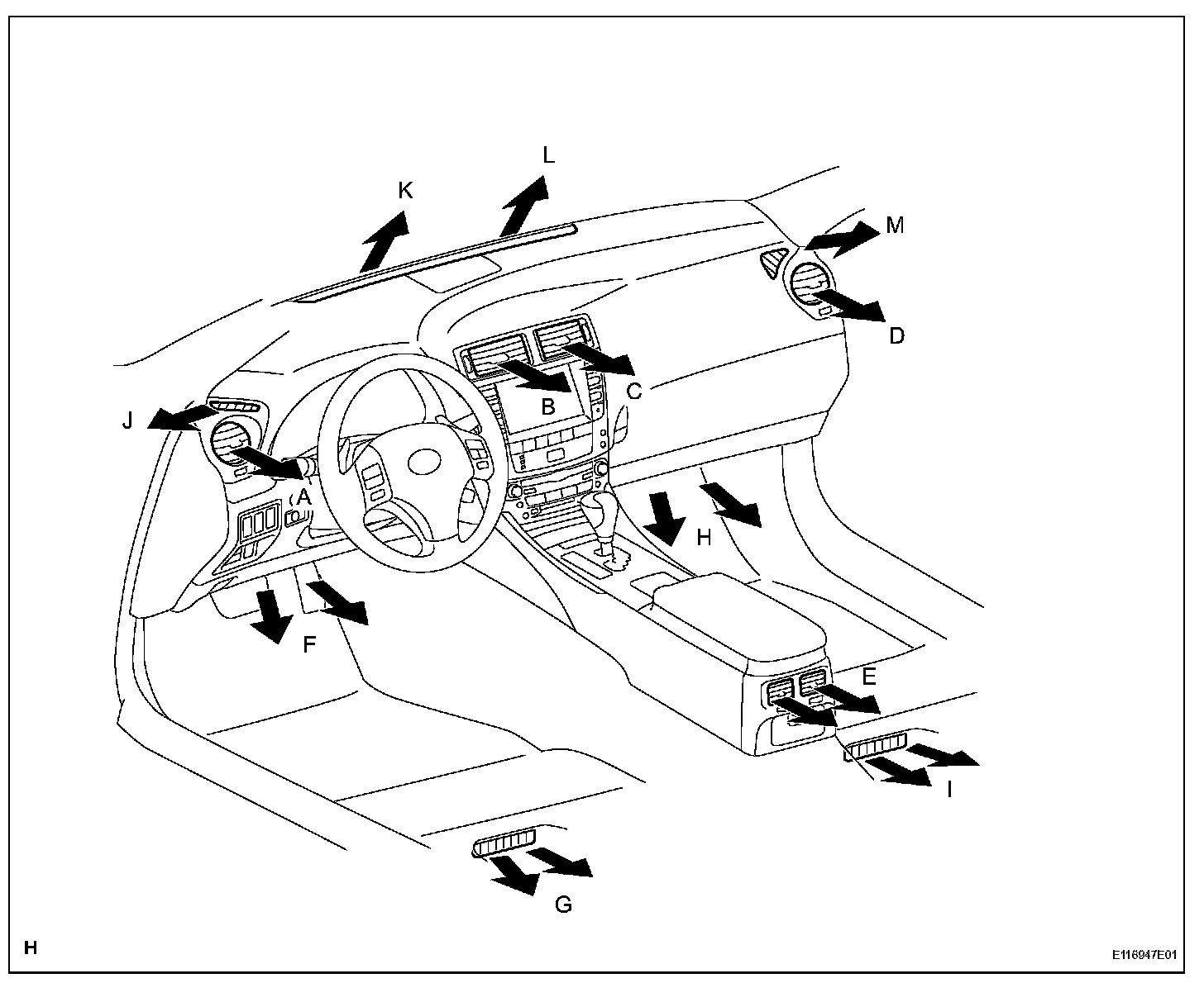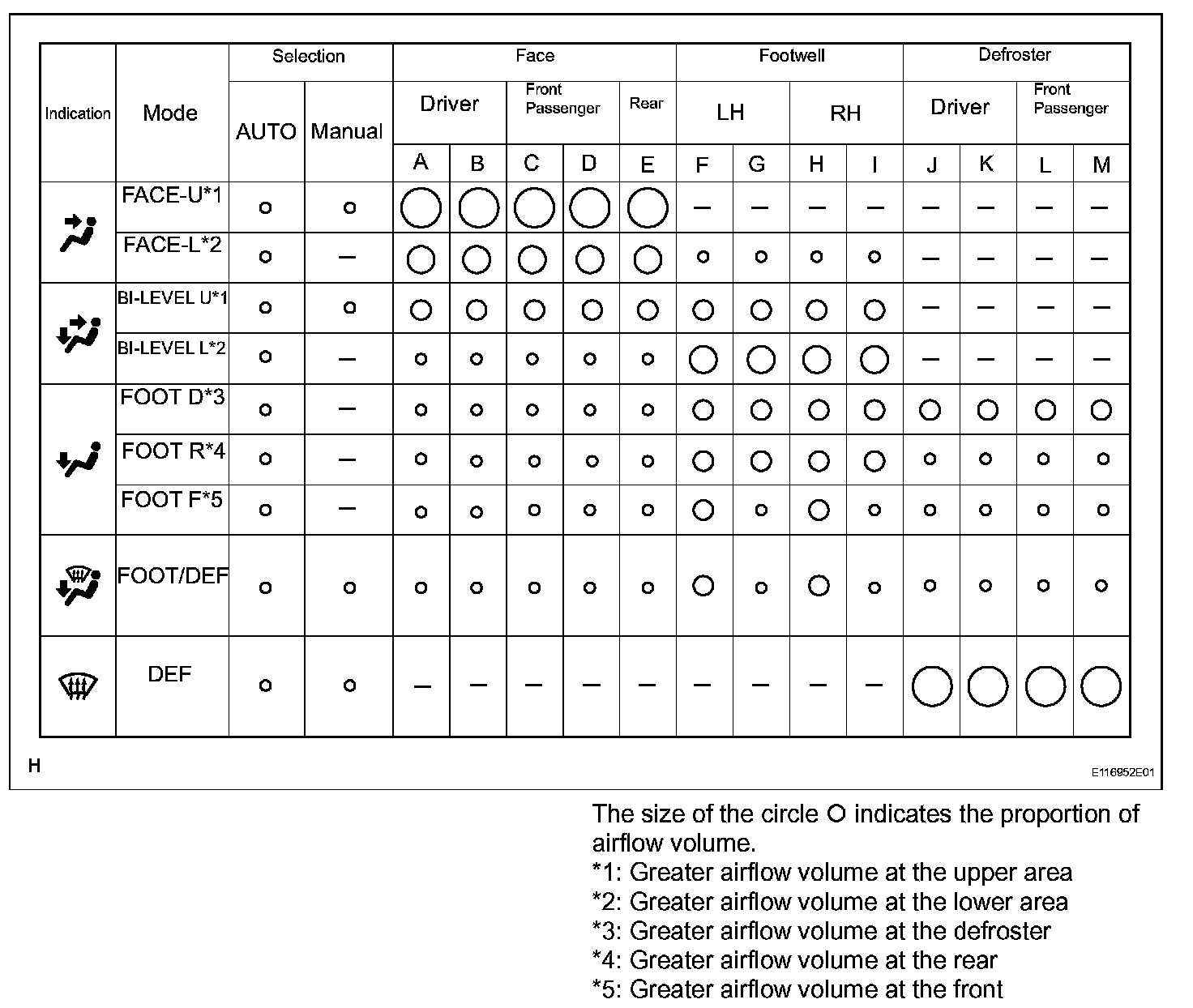 a. When the micro dust and pollen filter switch is pressed, the micro dust and pollen filter mode control is activated. Then, the air vent is switched to the FACE mode and recirculated pollen free air flows in the area around the upper part of the bodies of the driver and front passenger.