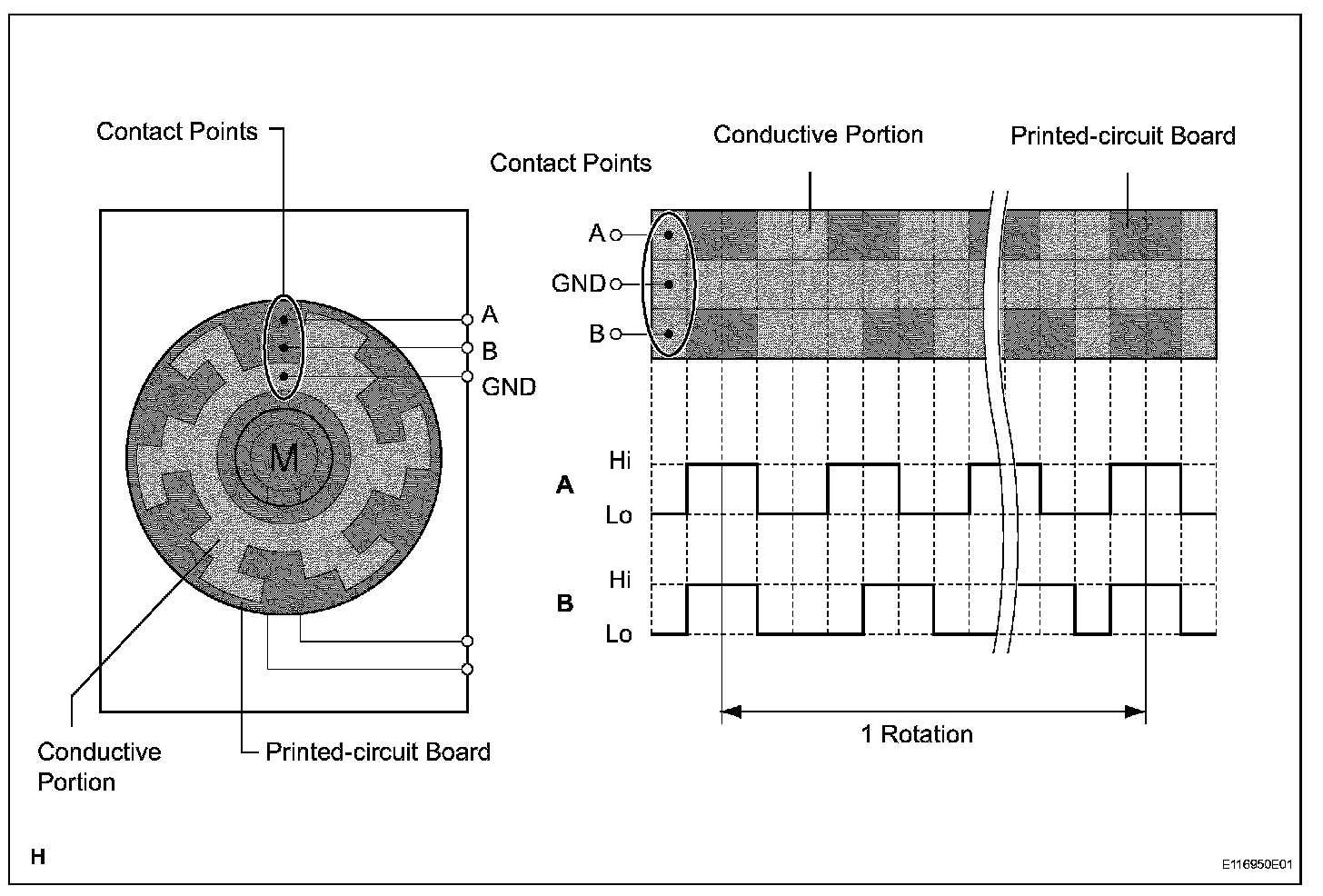 a. The pulse pattern type servo motor consists of a printed circuit board and a servo motor. The printed circuit board has three contact points, and can transmit two ON-OFF signals to the A/C ECU based on the difference of the pulse phases. The BUS connector can detect the damper position and movement direction with this signal.