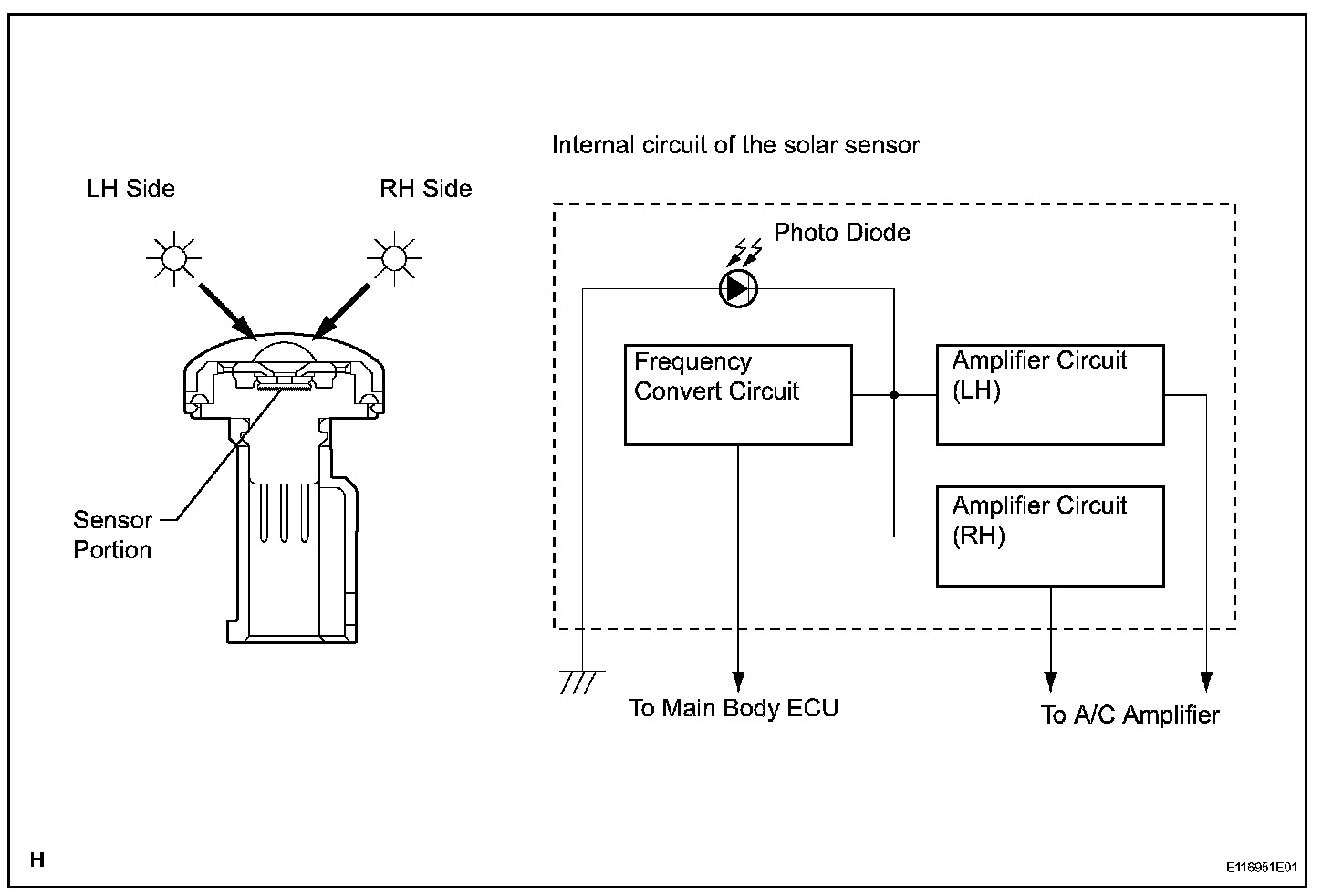b. A solar sensor detects (in the form of changes in the current that flows through the built-in photo diode) the changes in the amount of sunlight from the LH and RH sides (2 directions) and outputs these sunlight strength signals to the A/C amplifier.